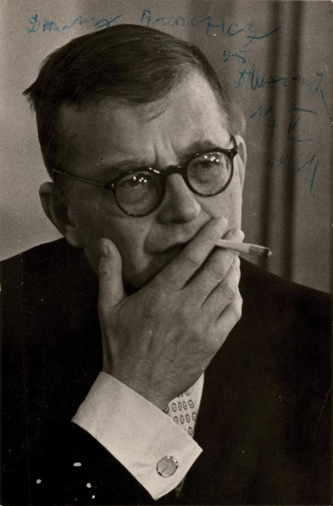 Russian composer and pianist (1906-1975) who is regarded as one of the major composers of the 20th century. Vintage matte-finish 3.5 x 5.5 photo of Dimitri Shostakovich smoking a cigarette, signed in ballpoint, with Shostakovich adding a date of June 17, 1964. The reverse bears a Horst E. Schulze stamp. In very good to fine condition, with creasing to the left side, and moderate signature contrast.