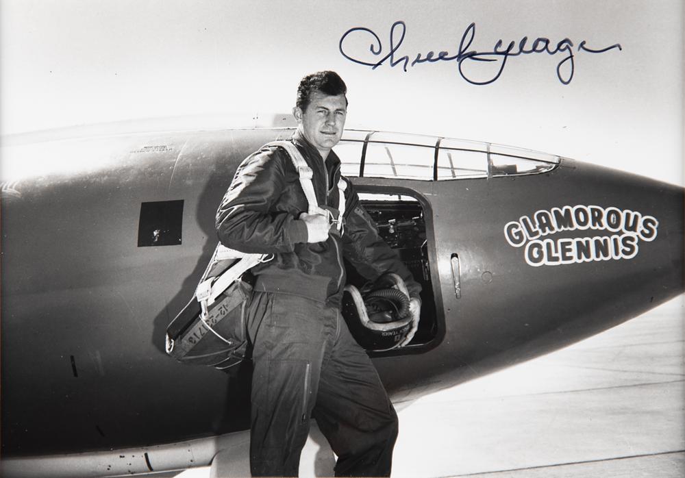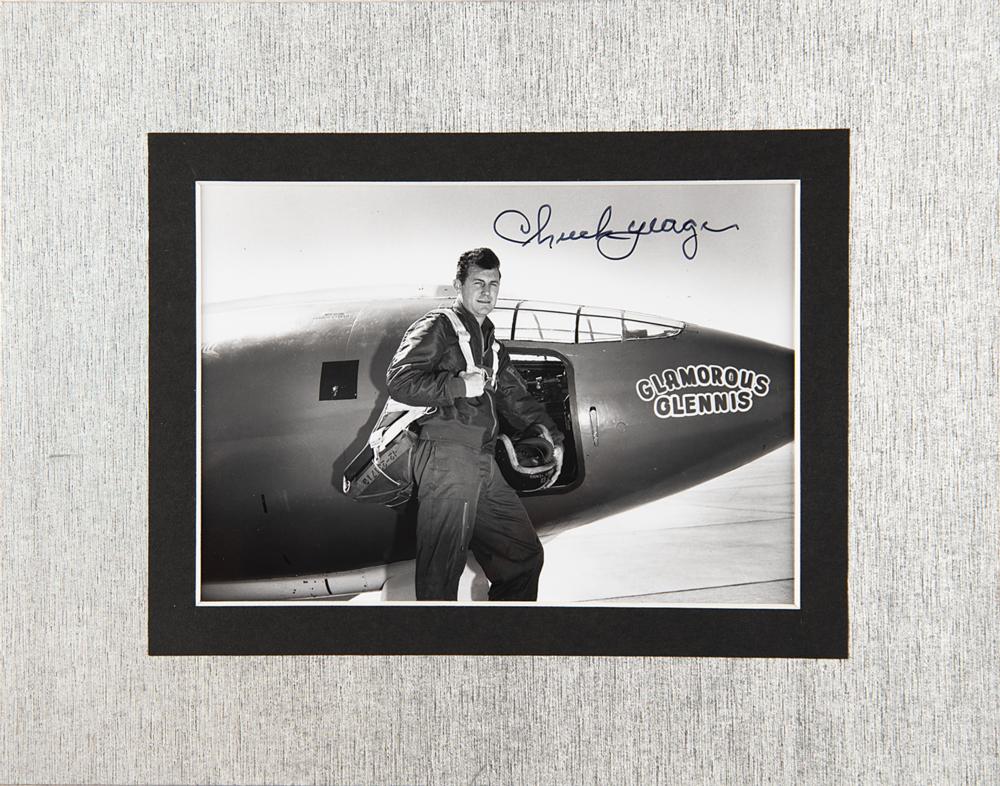 Glossy 6.25 x 4.25 photo of Yeager posing with his Bell X-1 rocket engine-powered aircraft, the Glamorous Glennis, signed in black felt tip. Double-matted to a slightly larger size and in very fine condition.