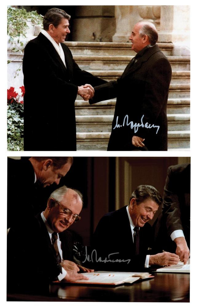 Two color glossy 10 x 8 photos of Mikhail Gorbachev meeting with Ronald Reagan, each signed in silver ink by the former president of the Soviet Union. In overall fine to very fine condition.