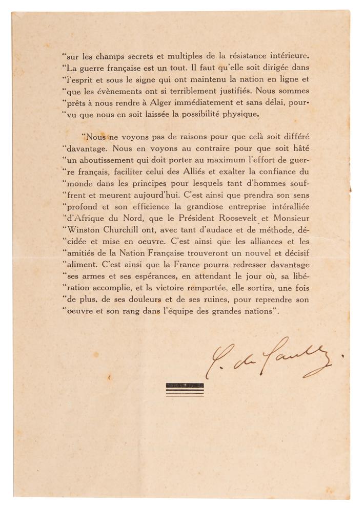 We see no reason for this to be delayed further. On the contrary, we see them so that an outcome may be hastened which should maximize the French war effort, facilitate that of the Allies and exalt the confidence of the world in the principles for which so many men are suffering and dying today. This is how the grand inter-allied enterprise of North Africa, which President Roosevelt and Mr. Winston Churchill, with so much audacity and method, decided on and implemented, will take on its profound meaning and its efficiency. It is thus that the alliances and friendships of the French Nation will find new and decisive nourishment. It is in this way that France will be able to straighten out her arms and her hopes even more, while awaiting the day when, her liberation accomplished, and the victory won, she will emerge, once more, from her pains and her ruins, to resume his work and his rank in the team of the great nations.’ In fine condition.