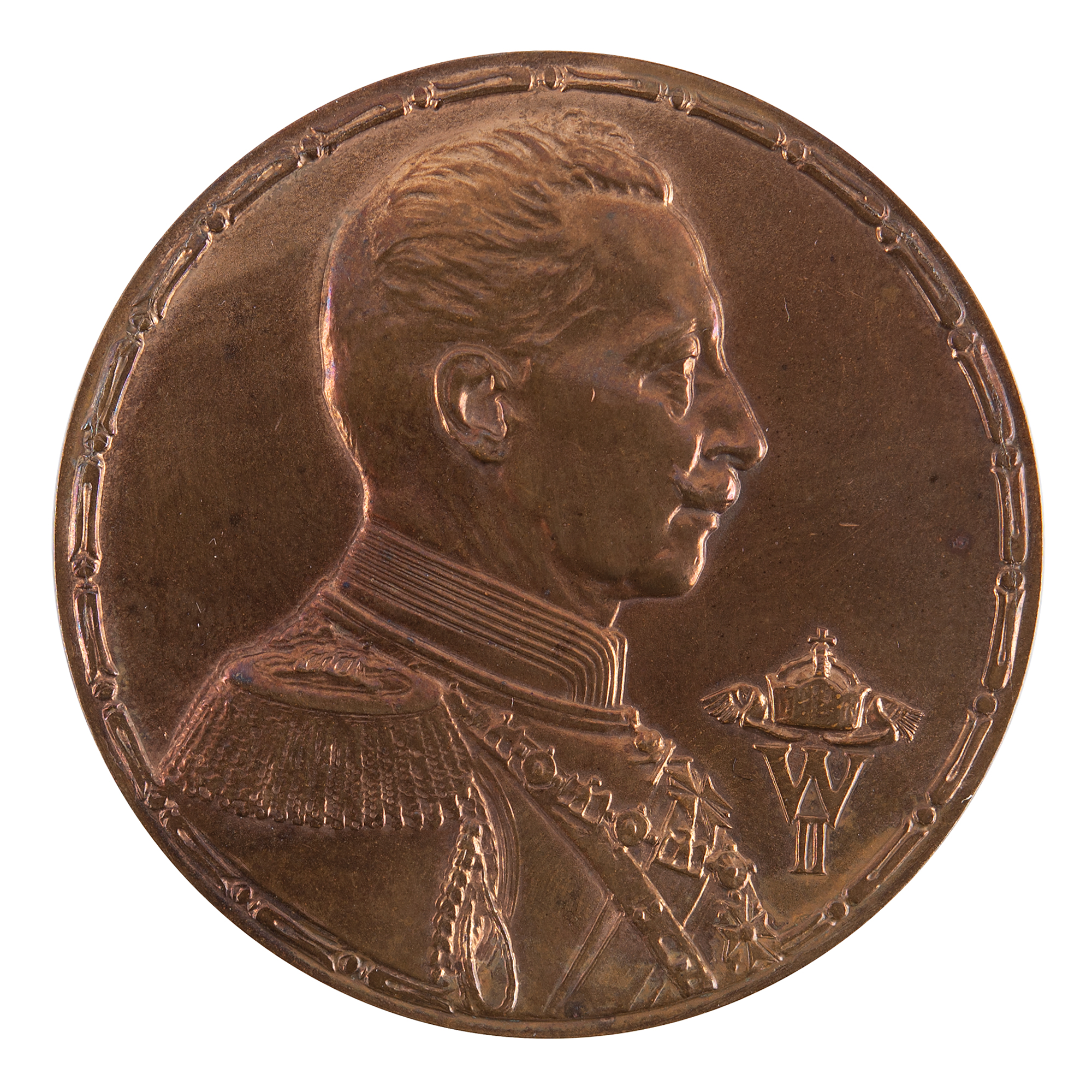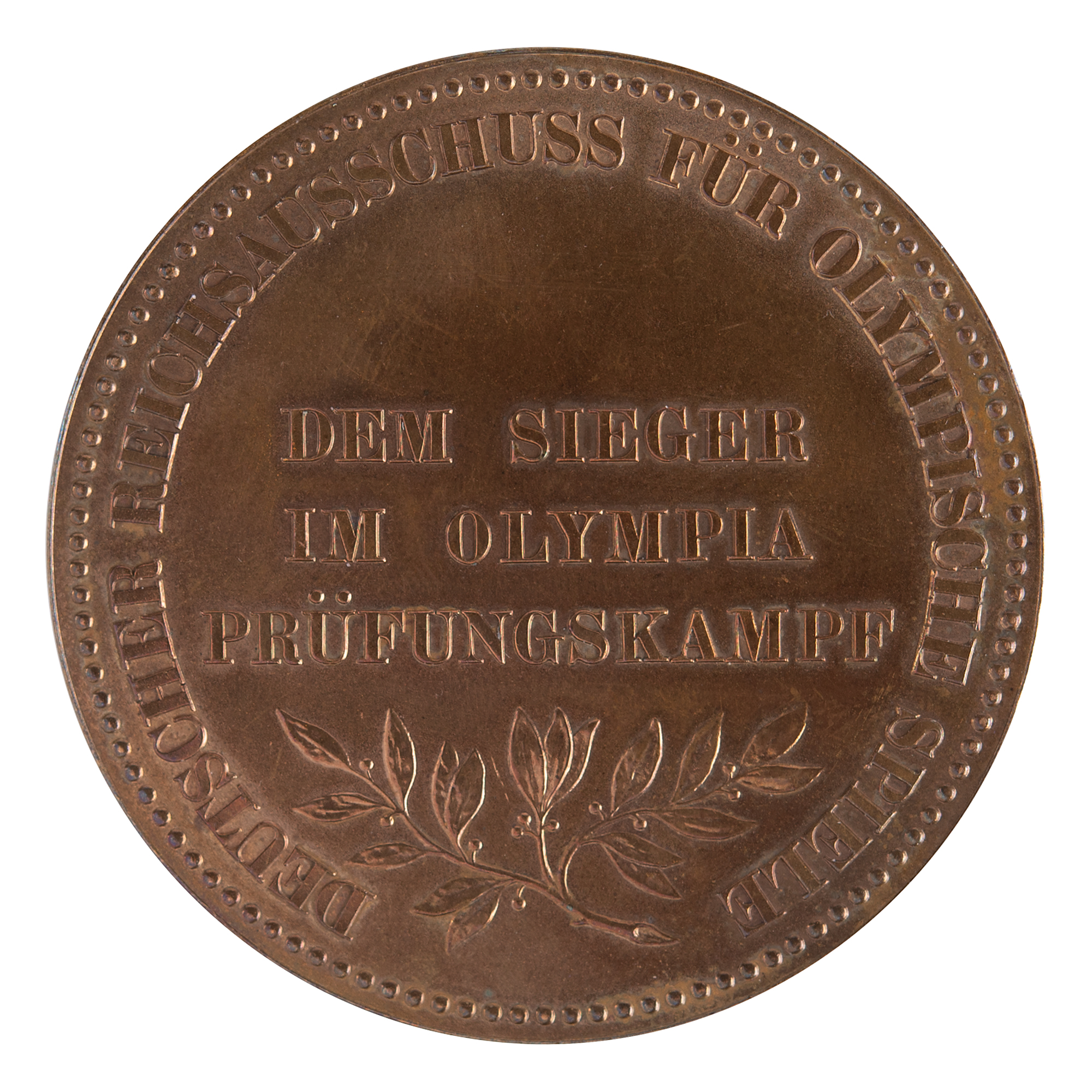 Winner’s medal issued for the German Olympic trials prior to the canceled Berlin 1916 Olympics. Bronze, 50 mm, 54 gm. The front features a bust of Kaiser Wilhelm II of Germany; the reverse reads (translated), “The Winner in the Olympic Trial Contest,” with “The German Committee for the Olympic Games” around the perimeter. The 1916 Olympics were scheduled to be held in Berlin, Germany, but were eventually canceled due to the outbreak of World War I. Any memorabilia related to the 1916 Olympiad is thus quite uncommon, with this being a particularly attractive example.