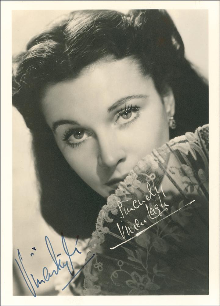 Superb vintage matte-finish 5 x 7 photo of Leigh in her iconic role of Scarlett O'Hara from the classic film Gone With the Wind, signed neatly in fountain pen. Photo also bears a pre-printed signature and sentiment. In very fine condition.