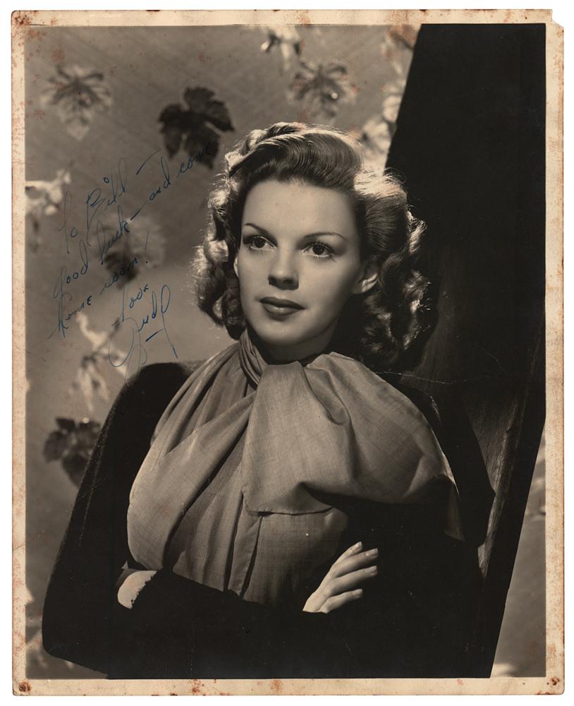 Vintage matte-finish 8 x 10 photo of Garland with her arms folded in a half-length pose against a leaf-pattern backdrop, signed and inscribed in fountain pen, "To Bill — good luck — and come home soon! Love, Judy.” In very good to fine condition, with a small crease above Garland's left shoulder, and damage to the borders which could easily be matted out to produce quite an attractive display.