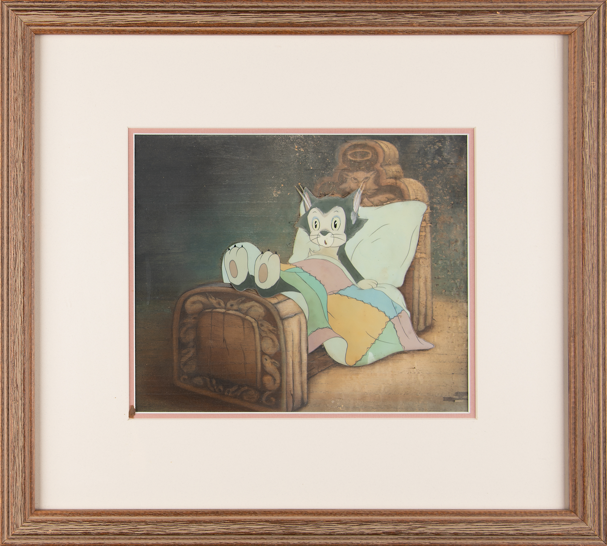 (Walt Disney Studios, 1940) Original production cel featuring Figaro from Pinocchio, depicting Geppetto's pet cat lying in bed with a surprised expression. The cel has been trimmed and applied to a hand-painted woodgrain background as prepared by Courvoisier Galleries for sale. Image (cat and bed) measures 6 x 5, with a mat opening of 9.5 x 8. Double-matted and framed to an overall size of 17.25 x 15.75. In very good condition, with noticeable dampstaining to wood background, resulting in surface flaking and lifting; the cel, which also bears some lifting from the backdrop, retains its paint and color. Accompanied by the original Walt Disney Productions label issued by the Courvoisier Galleries, which bears considerable water damage.
