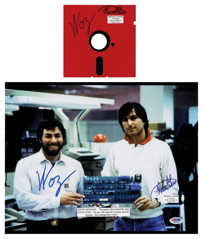 Two items: a color satin-finish 14 x 11 photo of Apple co-founders Steve Jobs and Steve Wozniak holding an Apple I circuit board during the early days of personal computers, signed in blue felt tip by Apple co-founders Steve Wozniak, “Woz,” and Ron Wayne, “Ronald G. Wayne,” who signs over his embossed personal seal; and a red 5.25″ floppy disk signed in black felt tip, "Woz" and "Ronald Wayne," who has affixed his personal label below. In overall fine condition, with affixed caption labels and a PSA/DNA label to the photo.