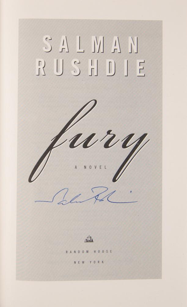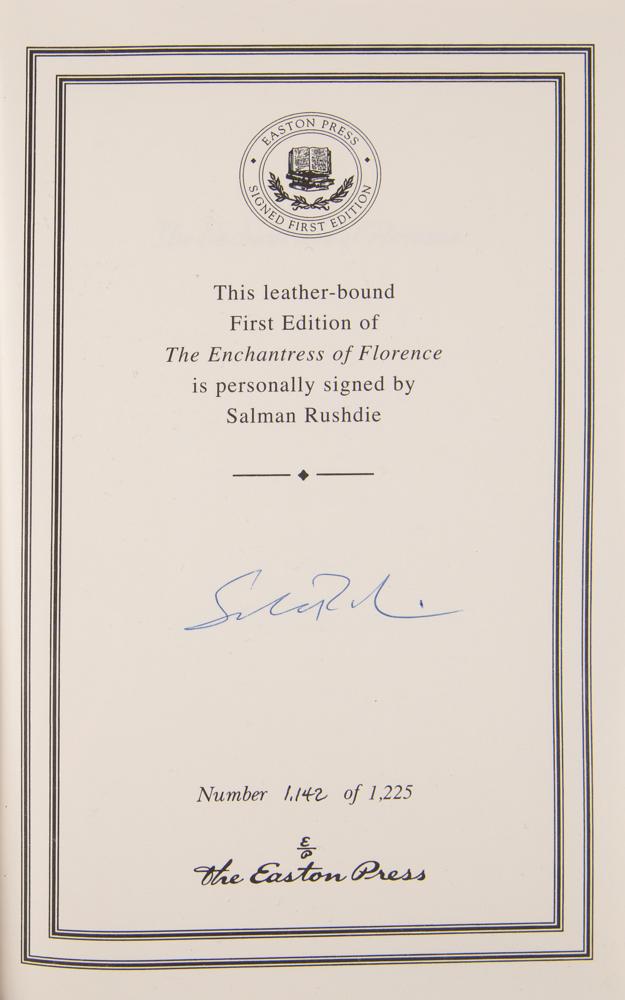 Two books: a first edition of Fury, hardcover with dust jacket, signed on the title page in blue ballpoint by Salman Rushdie; and an Easton Press limited first edition of The Enchantress of Florence, leather-bound hardcover, numbered 1142/1225, signed on the colophon in blue ballpoint by Salman Rushdie. In overall very fine condition.