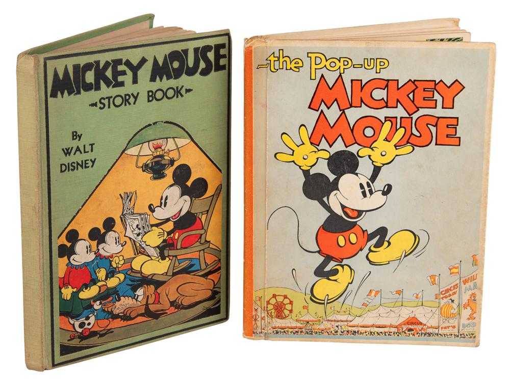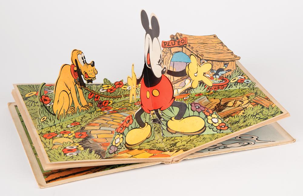 First edition book: The Pop-Up Mickey Mouse. New York: Blue Ribbon Books, 1933. Hardcover bound in pictorial boards, 6.75 x 8.75, with all three pop-up scenes intact: Mickey and Minnie at the circus, Mickey with Pluto and his dog house, and Mickey and Minnie waving goodbye to a steamship. Book condition: VG-/None, with rubbing to boards, some staining to title page, and a gift inscription to title page.