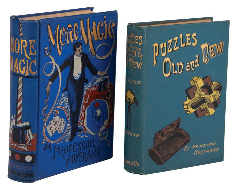 Two hardcover magic books by 'Professor Hoffman,' the pseudonym of Angelo John Lewis, who was one of the most prolific and influential magic authors of the 19th century. Includes: More Magic, published in London by George Routledge and Sons, 1890, bound in the original attractive blue pictorial cloth, 5.75 x 7.75, 457 pages; and Puzzles: Old and New, published in London by Frederick Warne and Co., [no year], bound in the original attractive green pictorial cloth, 5.5 x 7.5, 394 pages. In overall very good to fine condition.