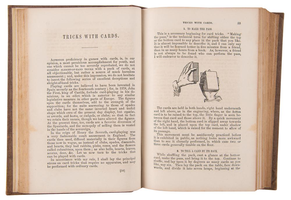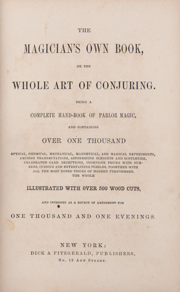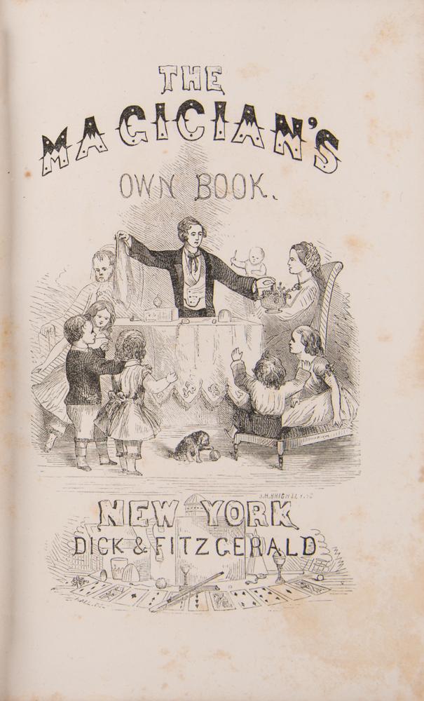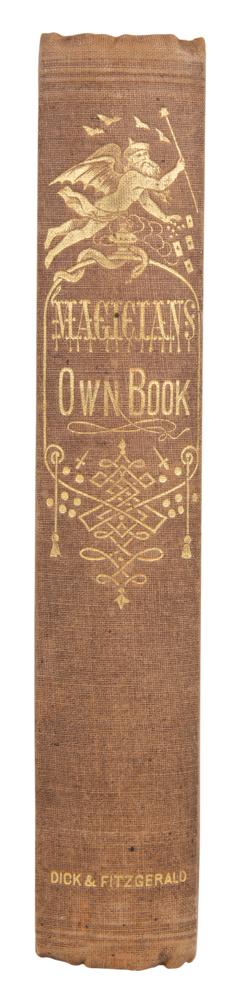 Unsigned book: The Magician's Own Book, or the Whole Art of Conjuring. First edition. NY: Dick & Fitzgerald, 1857. Hardcover bound in brown cloth with gilt-stamped title and decoration, 5.25 x 7.75, 362 pages. Illustrated with over 500 woodcuts, this early "complete hand-book of parlor magic" offers comprehensive explanations of myriad tricks, illusions, and magical experiments. Book condition: VG/None, with sunning to spine and boards and minor scattered staining to textblock.