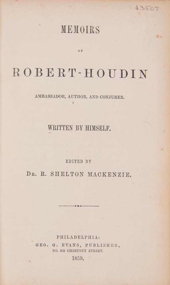 Uncommon book: Memoirs of Robert-Houdin. First American edition. Philadelphia: Geo. G. Evans, 1859. Hardcover bound in the original brown pebbled cloth with gilt title on spine and embossed publisher's device on boards, 5.5 x 7.5, 445 pages. Book condition: VG-/None, with sunning to spine, some staining to boards, wear to bumped corners, and slight fraying to spine tail.
