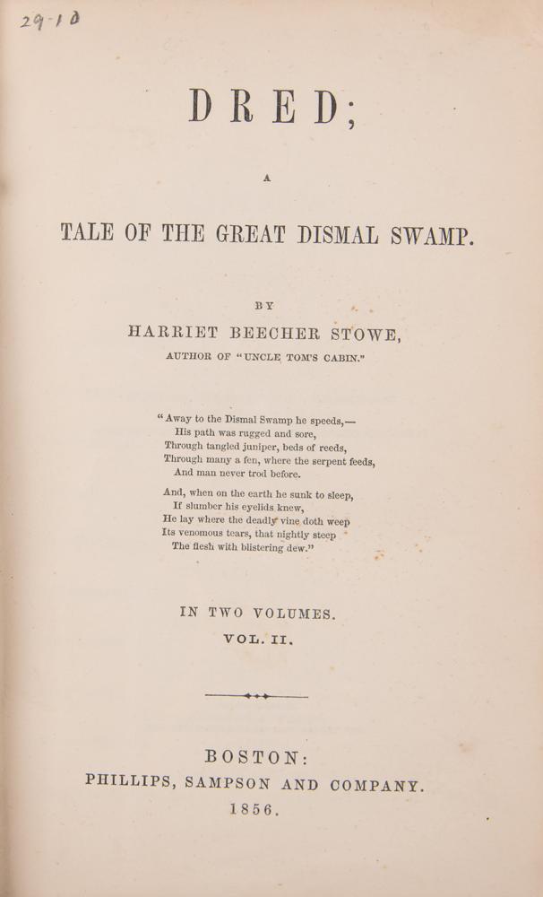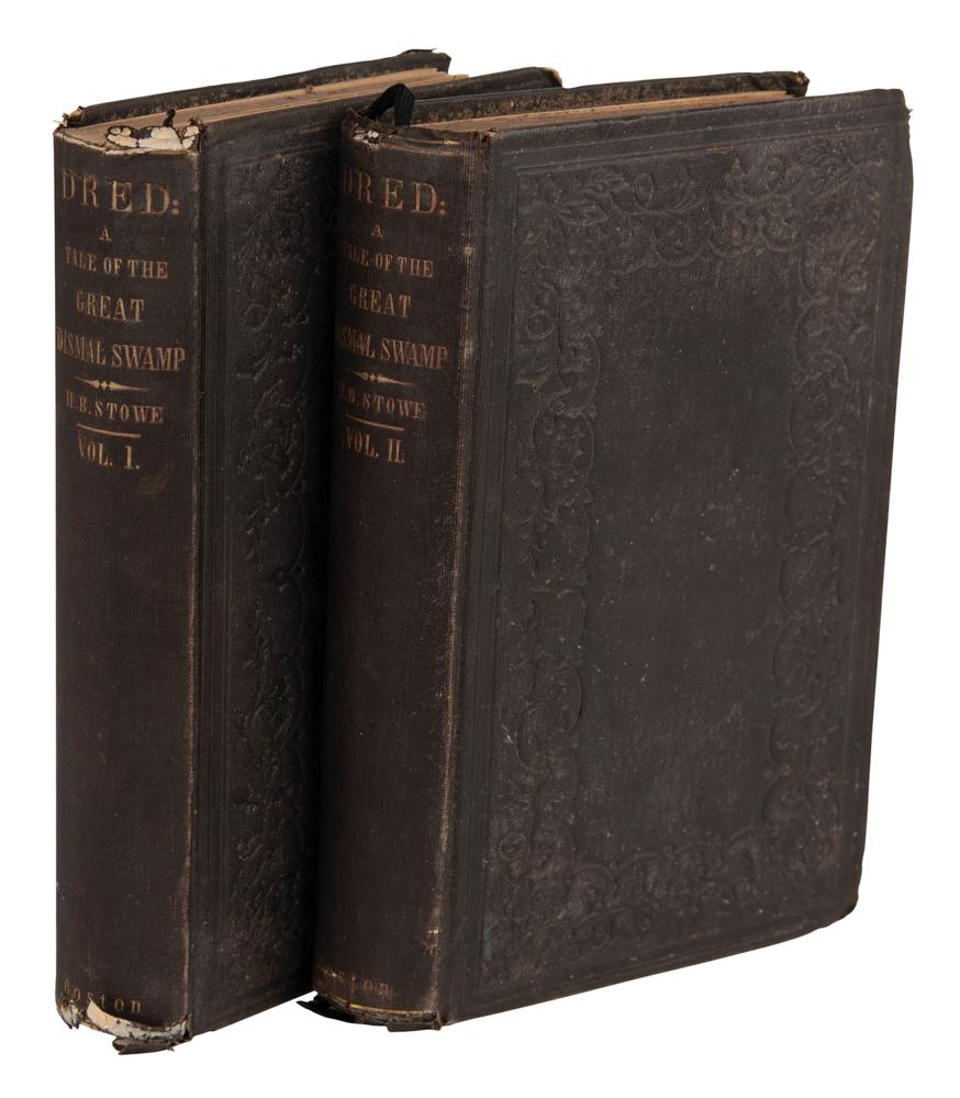 Uncommon first edition book: Dred; A Tale of the Great Dismal Swamp, Vols. I and II, by Harriet Beecher Stowe. First edition, first printing (with "d" in "dictatorial" directly below the terminal "r" in "rather" on p. 88, and the phrase "the Dicksons are fewer" on p. 370). Boston: Phillips, Sampson and Company, 1856. Hardcovers bound in the publisher's dark brown cloth with gilt titles on spine, 5.25 x 8, 329 and 370 pages. Book condition: G+/None, with heavy wear and chipping to spine extremities, and wear to bumped corners.