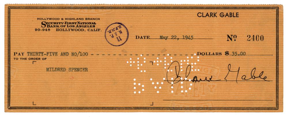 Personal check, 8.25 x 3.25, filled out in type and signed by Gable, "Clark Gable," payable to Mildred Spencer for $35, May 22, 1945. In fine condition, with three vertical creases.