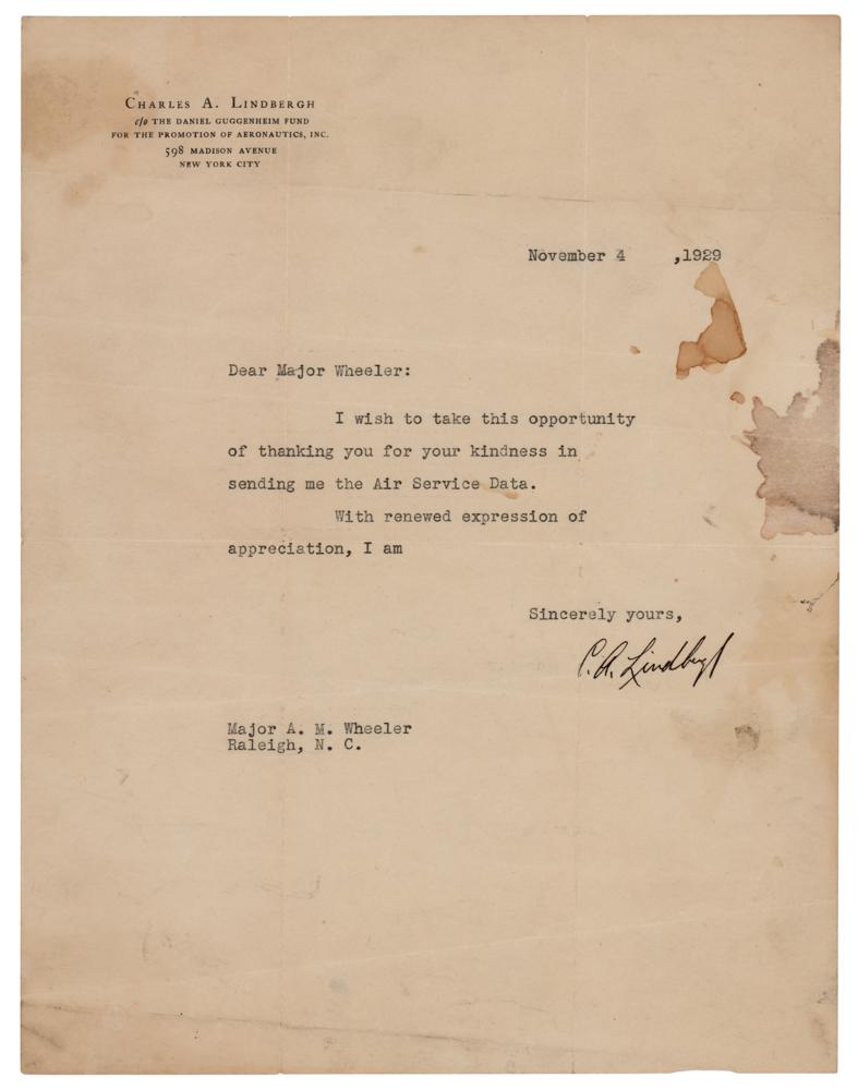 TLS signed “C. A. Lindbergh,” one page, 8.5 x 11, personal letterhead, November 4, 1929. Letter to Major A. M. Wheeler, in part: "I wish to take this opportunity of thanking you for your kindness in sending me the Air Service Data." In very good condition, with splits to the ends of some of the multiple intersecting folds, overall creasing, and area of staining.