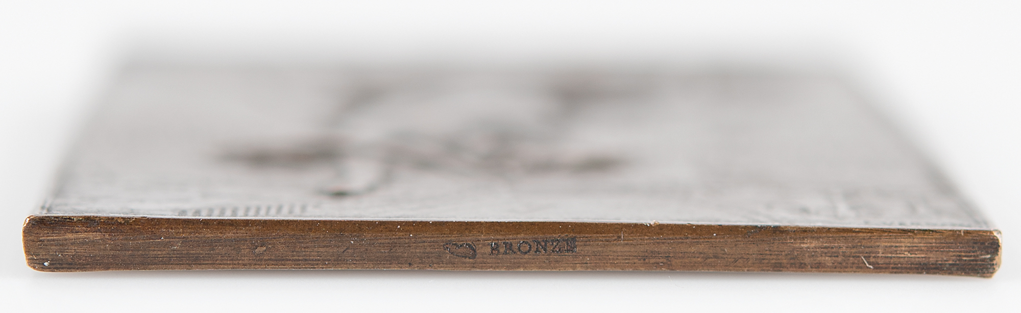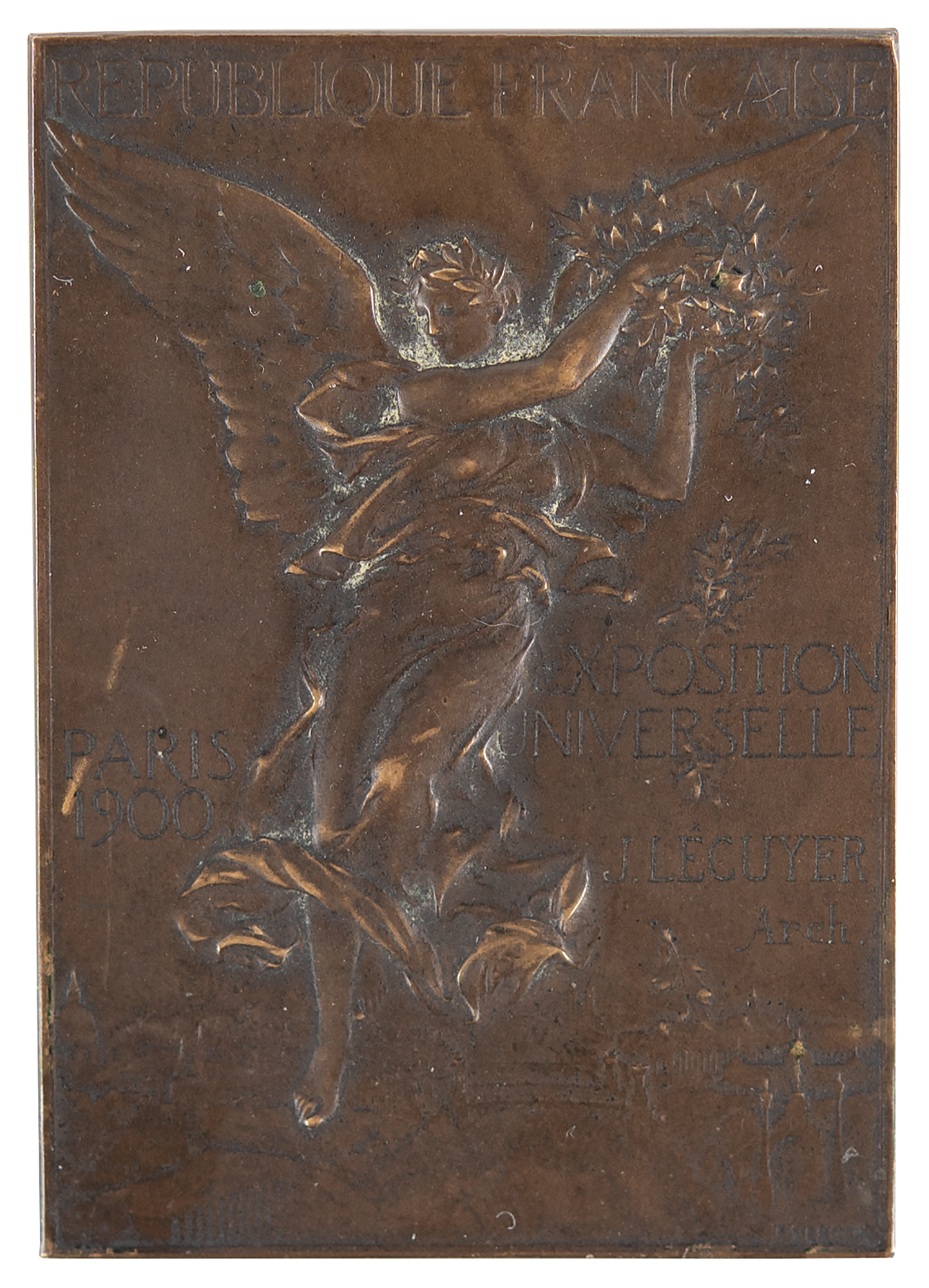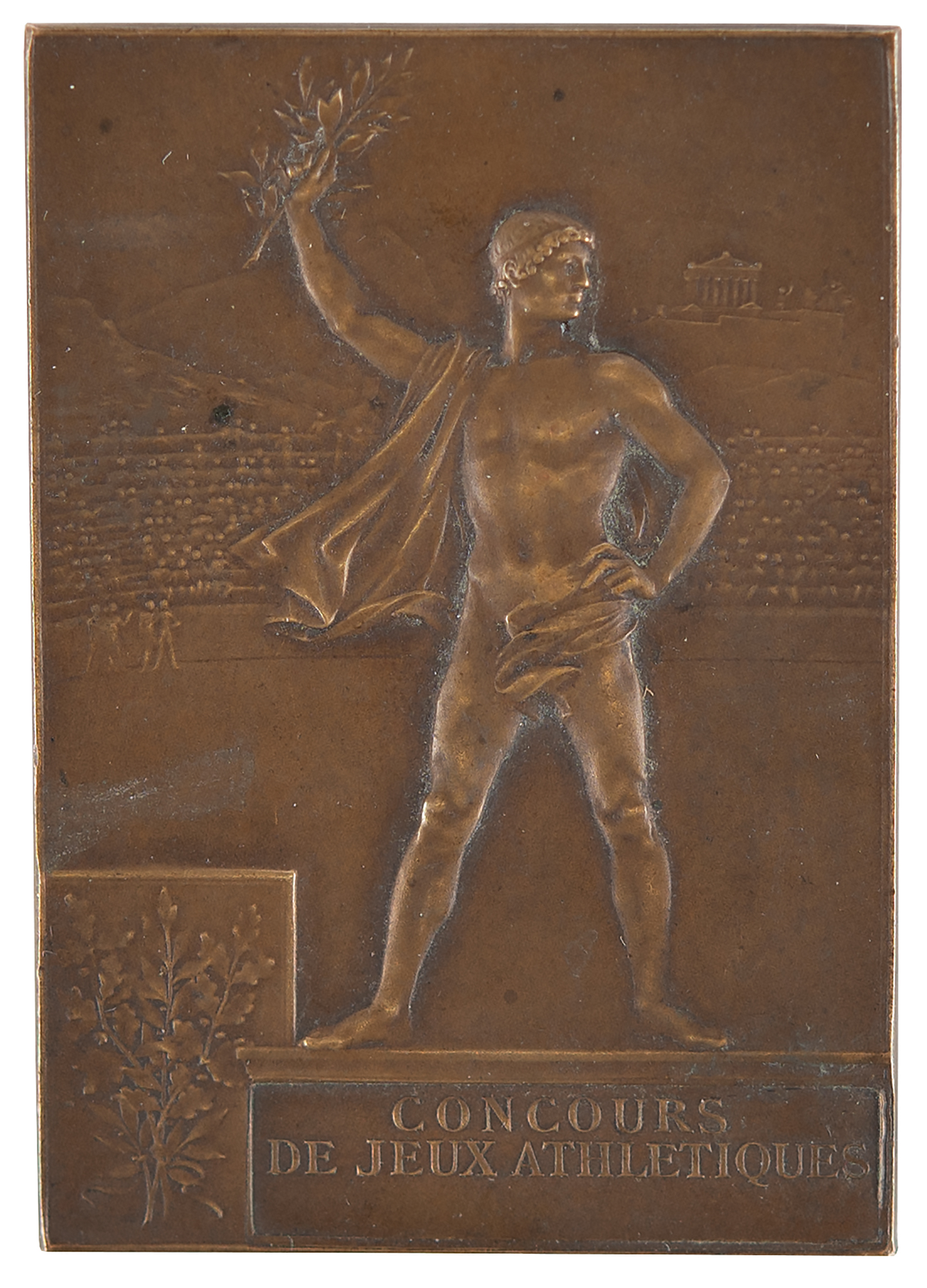 Winner’s medal issued for the Paris 1900 Olympics. Bronze, 42 mm x 60 mm, 52 gm, by Frederic Vernon, Paris. The front, inscribed “Republique Francaise, Exposition Universelle, Paris 1900,” features a winged goddess scattering laurels over the grounds of the Exposition; the front is also inscribed with a name, "J. Lécuyer, Arch.," ostensibly the recipient of the prize. The reverse identifies the sport as athletics, "Concours de Jeux Athletiques," and depicts a victorious athlete upon a podium with a stadium and the Acropolis in the background. Stamped "Bronze" on the edge.
