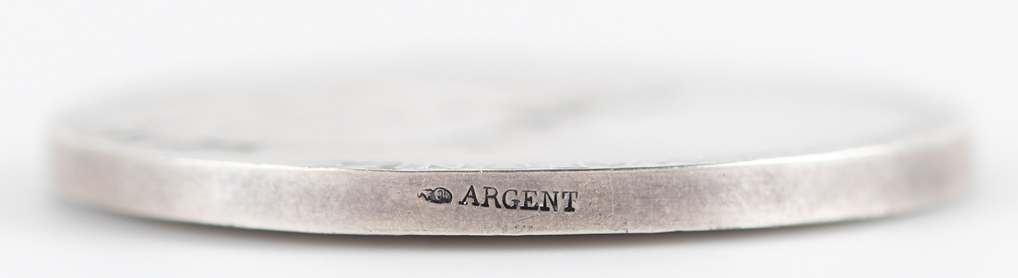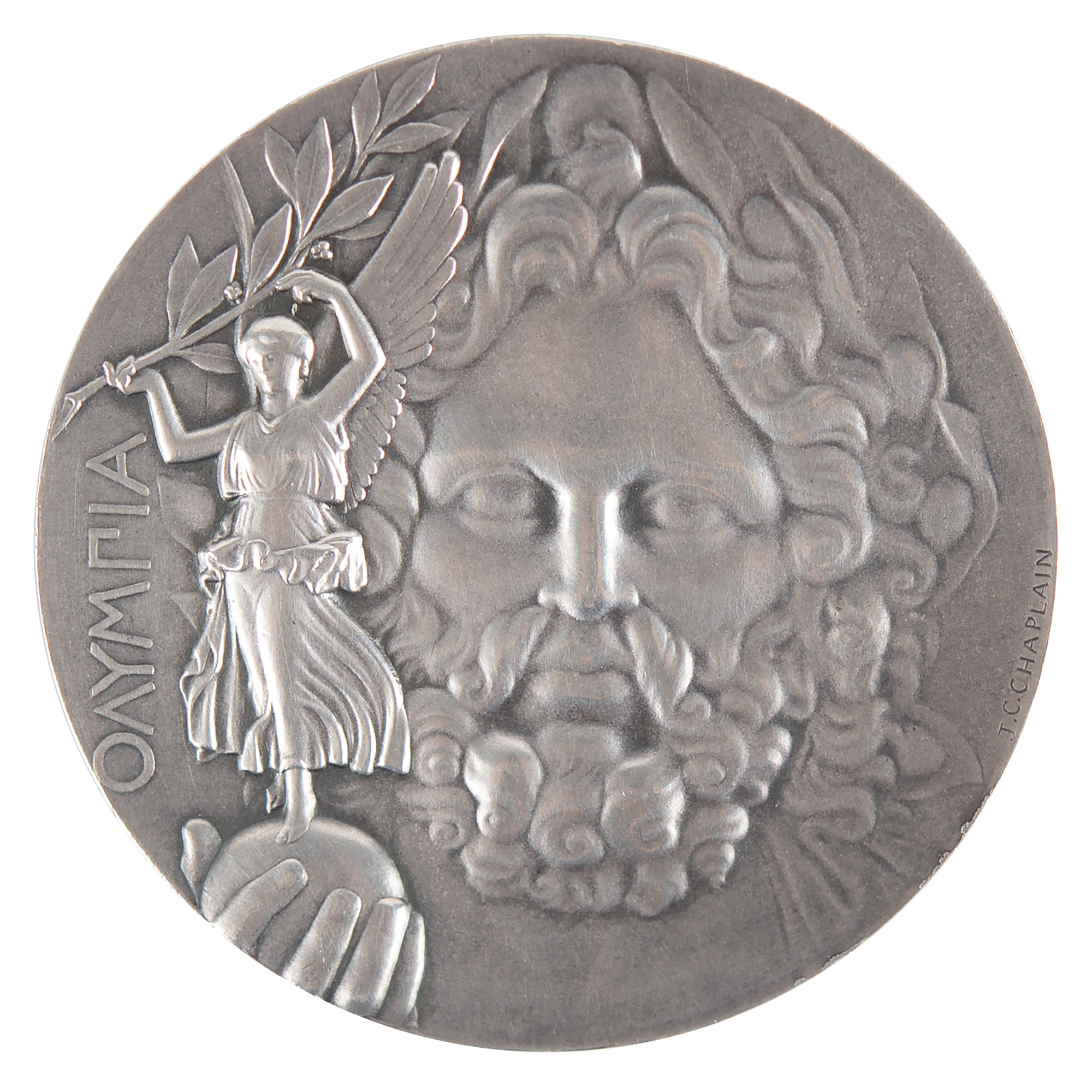 Exceedingly rare first-place winner’s medal issued for the Athens 1896 Olympics. Silver, 50 mm, 67 gm, by Jules Clement Chaplain. The front depicts a relief portrait of Zeus holding Nike, the goddess of Victory, in the palm of his hand, with text along left side, “Olympia”; the reverse bears a detailed view of the Acropolis of Athens topped by the Parthenon, with raised Greek characters to upper and lower portion (translated), “International Olympic Games in Athens, 1896.” Stamped “Argent” on the edge.
