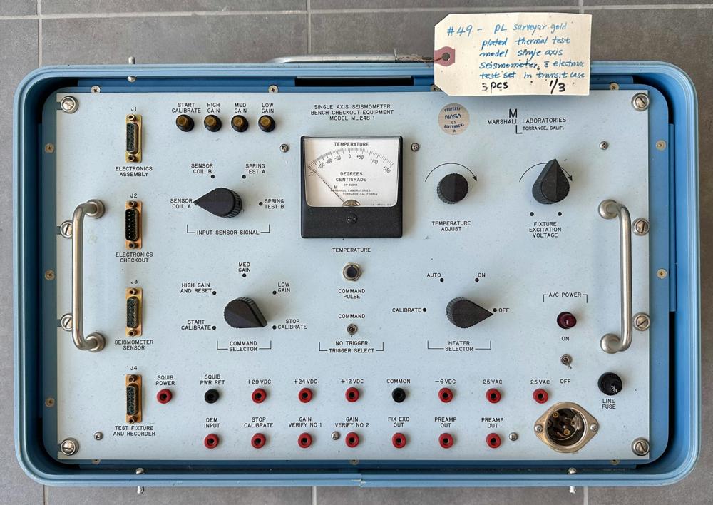 Ground Support Equipment (GSE) Surveyor Program Ground Test Equipment made by Marshall Laboratories of Torrance, California, with a removable cover that unlatches to reveal the impressive inner control panel, marked as “Single Axis Seismometer, Bench Checkout Equipment, Model ML248-1.”