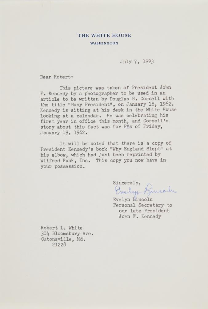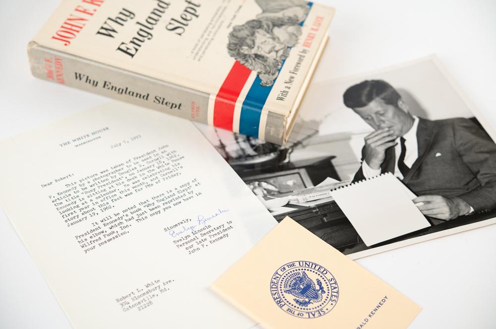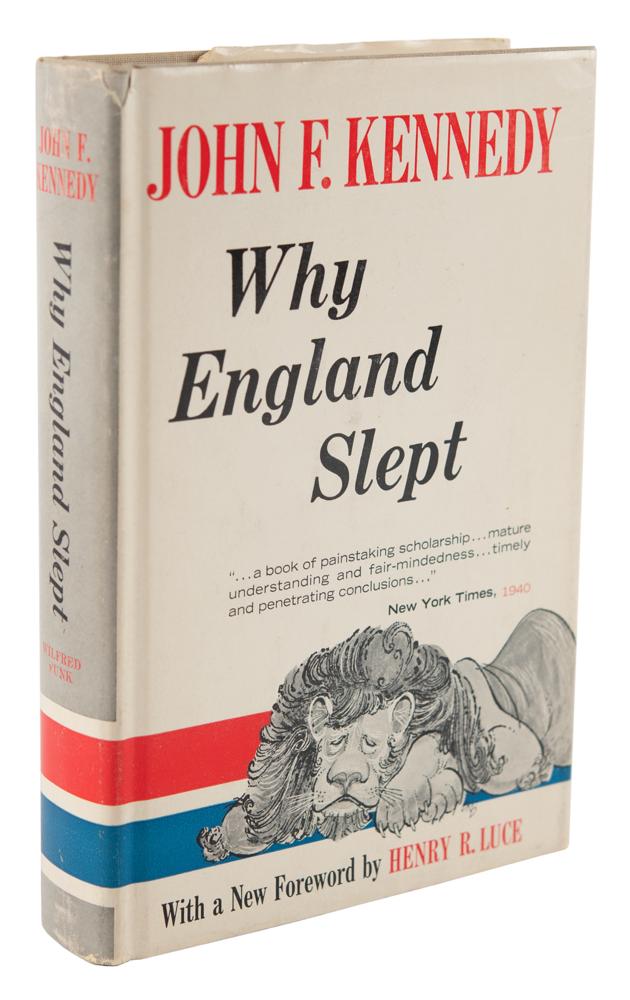 President John F. Kennedy's personally-owned copy of his book Why England Slept. Later printing. NY: Wilfred Funk, Inc., 1961. Hardcover with dust jacket, 5.75 x 8.5, 252 pages, with a card imprinted in blue with his name and the presidential seal loosely laid in. In fine condition, with light wear to the dust jacket. Accompanied by an original vintage glossy 9 x 7 silver gelatin press photo from January 1962, showing Kennedy at his desk in the White House, with this book seen beside him. Includes a letter of provenance signed by JFK's personal secretary, Evelyn Lincoln, in part: "This picture was taken of President John F. Kennedy by a photographer to be used in an article to be written by Douglas B. Cornell with the title 'Busy President,' on January 18, 1962. Kennedy is sitting at his desk in the White House looking at a calendar. He was celebrating his first month in office...It will be noted that there is a copy of President Kennedy's book 'Why England Slept' at his elbow, which had just been reprinted by Wilfred Funk, Inc. This copy you now have in your possession."