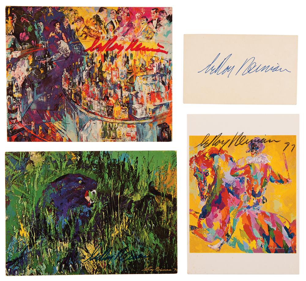 Four items: a felt tip signature, “LeRoy Neiman,” on an off-white 5 x 3 card; a color 5 x 7 print of the painting ‘Harlequin On Horseback,’ signed in black grease pencil, “LeRoy Neiman, 77”; a color 7.75 x 5.5 postcard of his ‘Black Panther’ painting, signed in blue felt tip; and a color 7.25 x 6 postcard of ‘Toot's Shor Bar,’ signed in red felt tip. In overall fine condition.