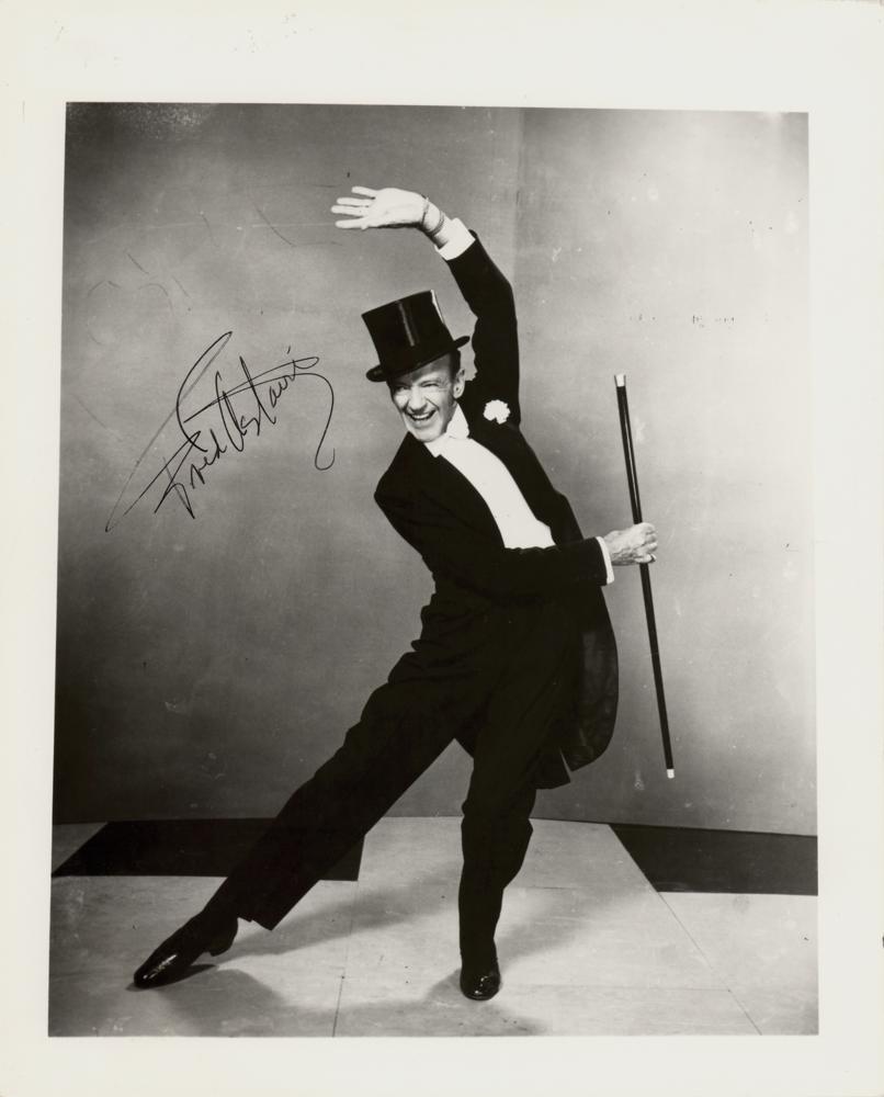 Glossy 8 x 10 full-length photo of Fred Astaire wearing a tuxedo during an energetic dance routine, signed in black ink. In very good to fine condition, with a couple of creases to the lower left corner tip, and a small area of emulsion irregularity.
