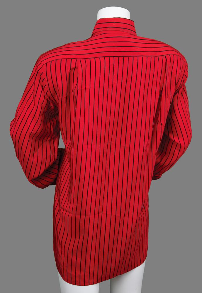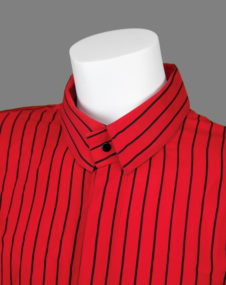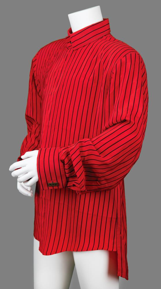 Prince's personally-owned custom-made red silk shirt with thin black vertical stripes, worn at the end of the Batman era and early on in the Nude Tour of Japan. The collared shirt features padded shoulders, wide French cuffs (one adorned with a brass-tone "Sexy" cufflink), and snap-down closure concealed by the front placket. In fine condition, with slight wear to cuffs. A handsome and stylish piece from Prince's personal wardrobe.