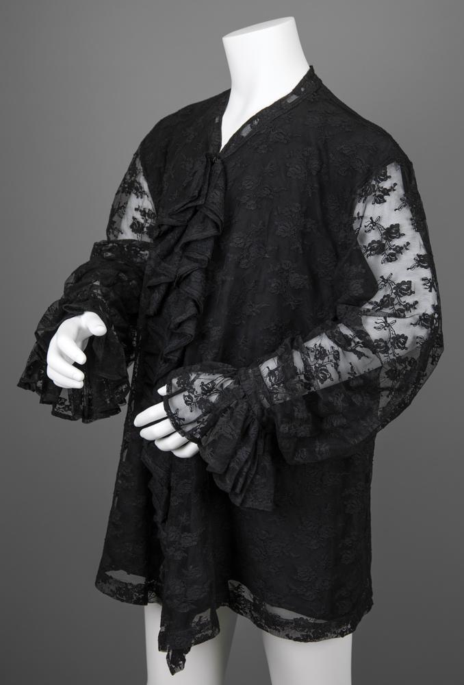 Prince's stage-worn black floral lace shirt from the 1998 New Power Soul Tour, featuring sheer long sleeves with flared cuffs, a solid black body, and a heavily ruffled front—recalling some of the iconic Prince costume designs of a decade earlier. In fine condition.