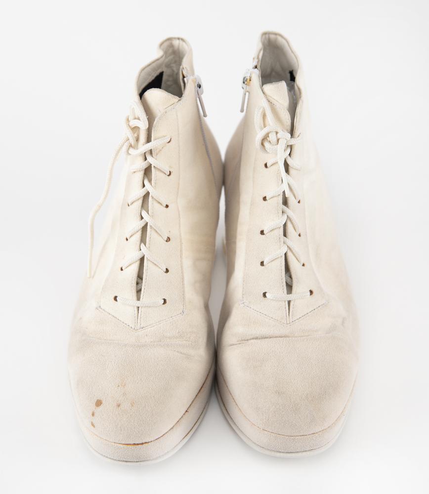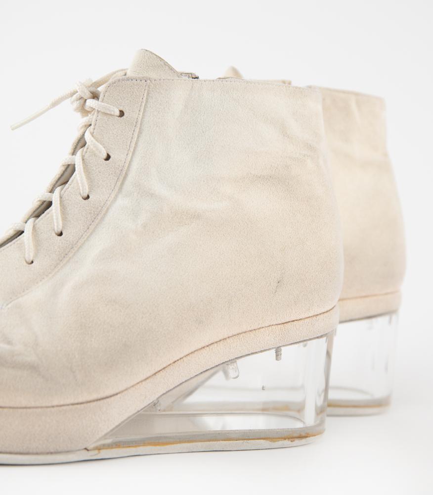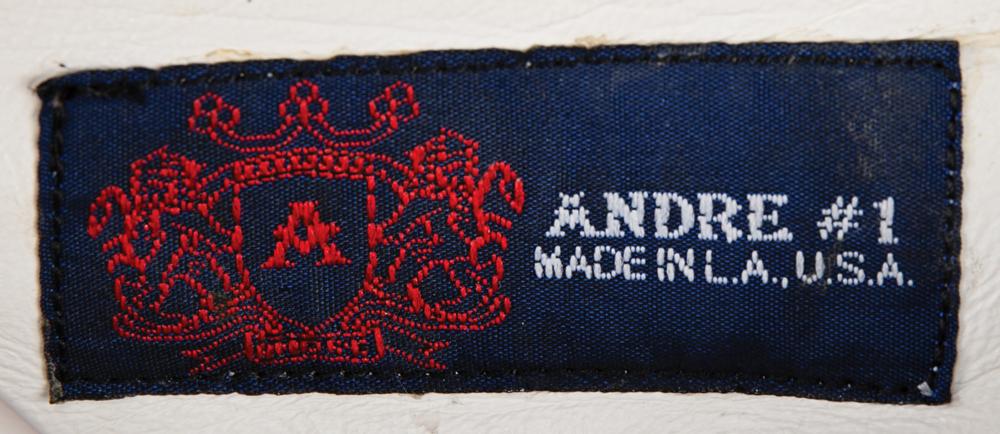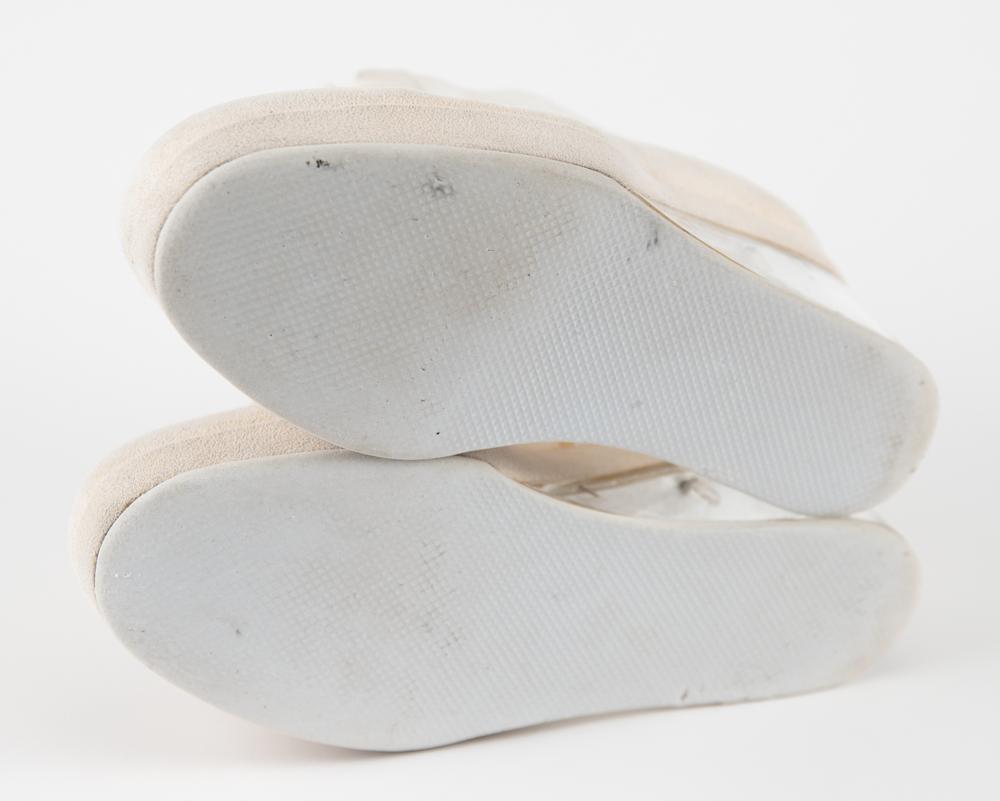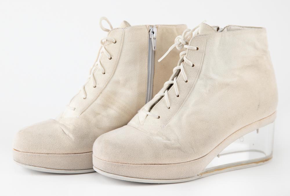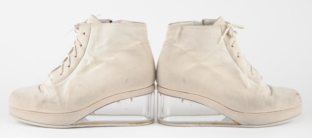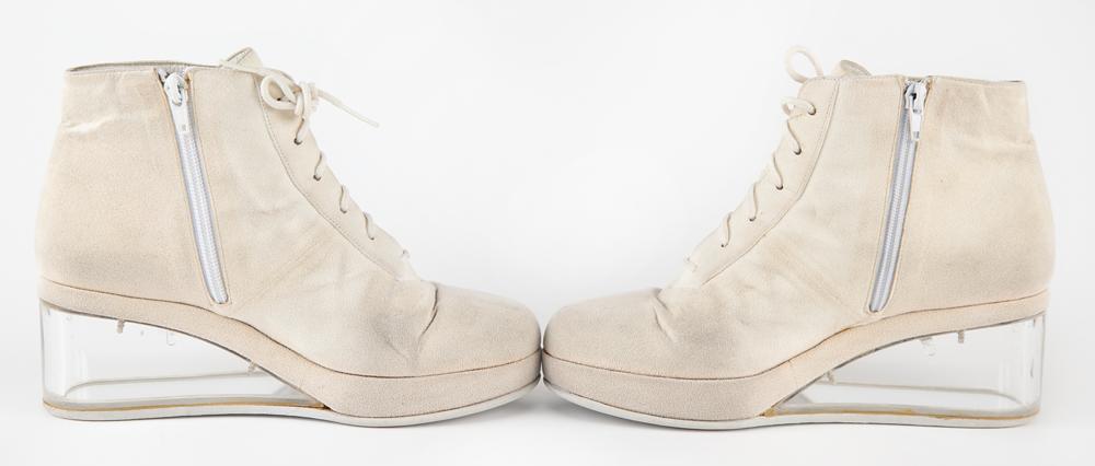 Prince's remarkable stage-worn, custom-made light-up wedge shoes from the Piano & a Microphone Tour, crafted by famous Sunset Boulevard cobbler shop Andre No. 1, who made about 3,000 pairs of shoes and boots for Prince over the course of two decades. The suede white leather shoes measure an overall 6.75″ tall (inclusive of the 2.25″ translucent wedge heels, which feature fully functional motion-activated red blinking lights inside), with zippered uppers and white rubber soles. Both have "Andre #1, Made in L.A., U.S.A." tags inside. In fine condition, with some scattered staining and the blinking lights still functional.