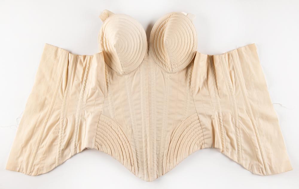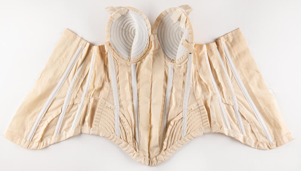 Prince's personally-owned Madonna-style 'cone bra' bodice prototype in a nude color, with the back left unsewn and the ribbon straps cut above the cone cups. The bodice is lined with several metal ribs to create the garment's form. In fine condition.