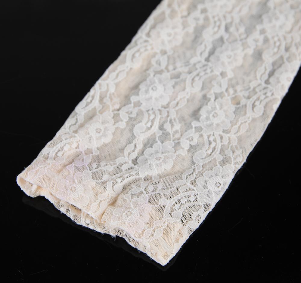 Prince's personally-worn white lace glove, measuring 21.5″ long, worn in the classic 1984 film Purple Rain and during the iconic 1984-85 Purple Rain Tour. The forearm-length glove features a delicate floral pattern, and as a stylish piece from Prince's Purple Rain wardrobe it is of the utmost desirability. In fine condition, with light overall wear from use.
