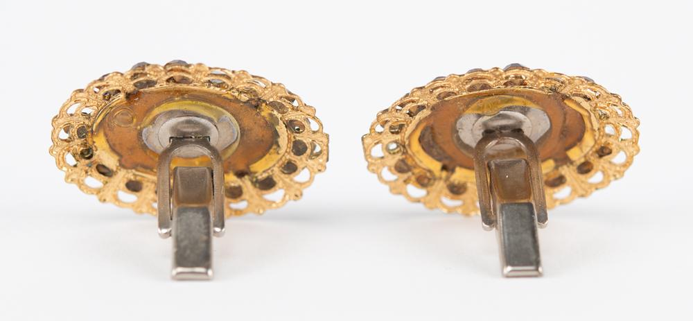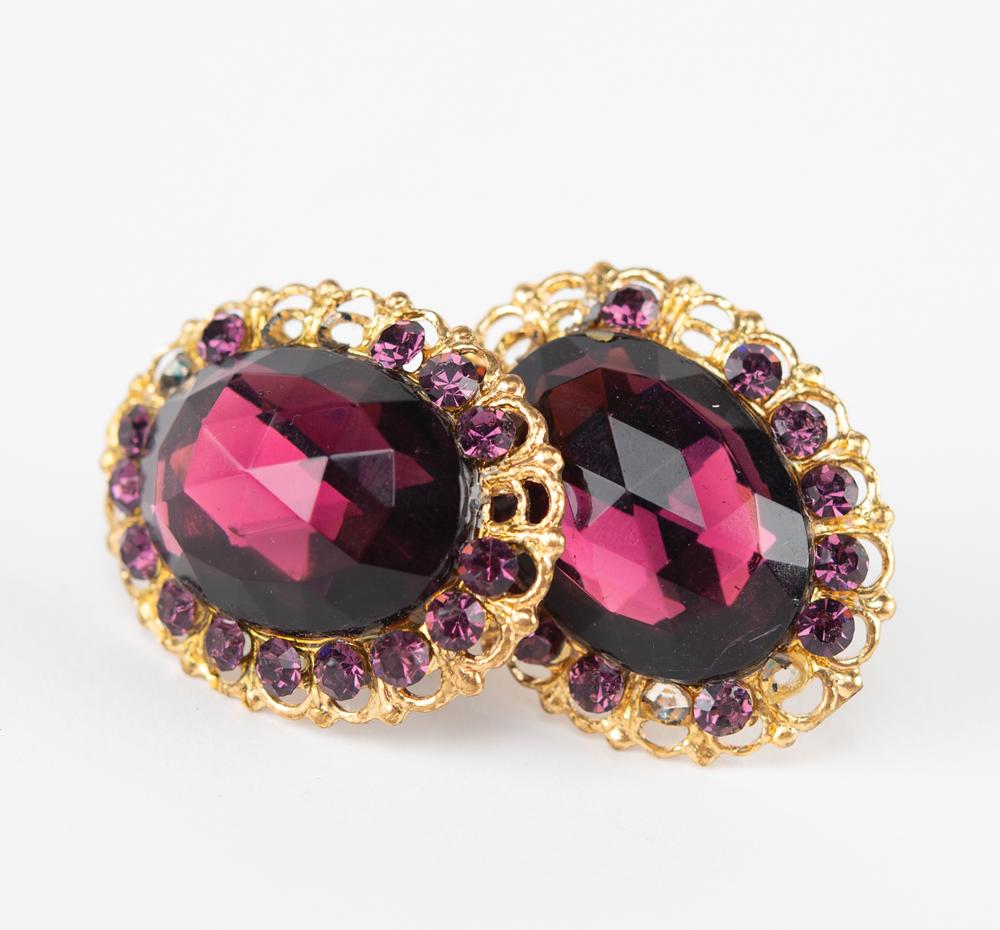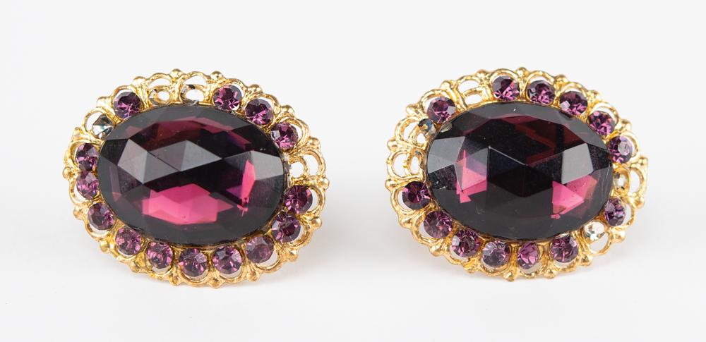 Stunning pair of ornamental cufflinks worn by Prince during the Purple Rain era, each measuring 1″ x 1.25″, featuring large central clear purple jewels encircled by matching purple faux gems, set upon gold-colored bases, retaining their posts and toggles. Removed prior to laundering, these cufflinks closely resemble the style found on Prince's iconic white ruffled shirt as seen in photographs from the Purple Rain Tour. In overall fine condition, with a couple of the tiny purple stones missing. Consignor notes that these were acquired directly from Prince's wardrobe designer.