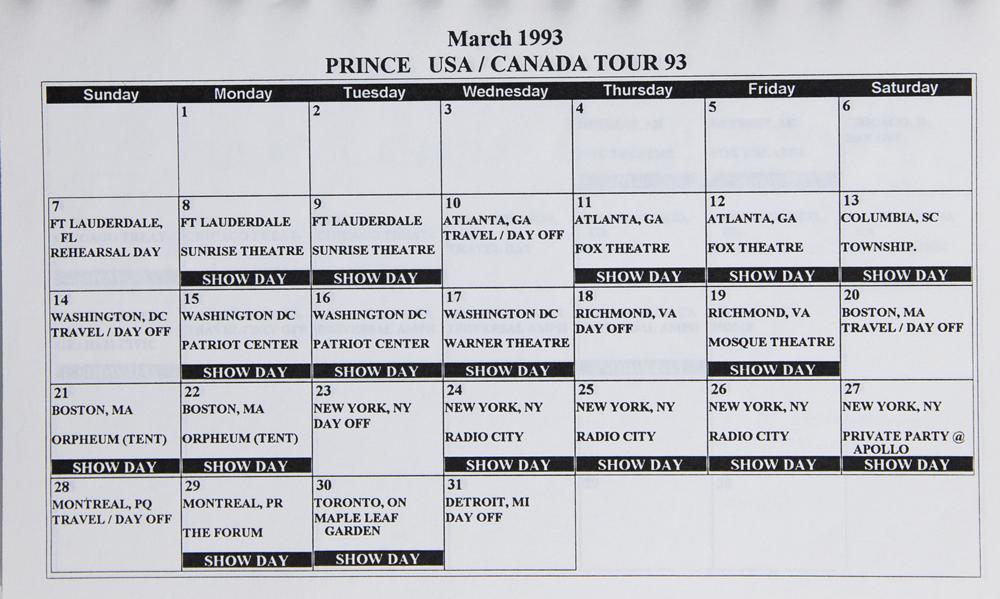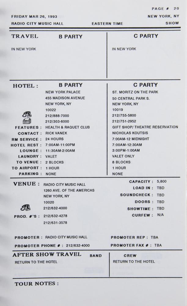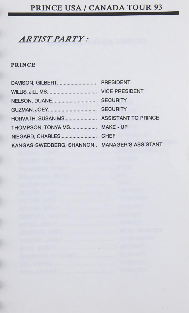 Uncommon spiral-bound tour itinerary published for distribution to the band and crew of the "USA/Canada" leg of Prince & the New Power Generation's "Tour 1993," the Act I Tour, 6 x 8.5, providing detailed travel plans including lists of the traveling parties, schedules, emergency contacts, flights, hotels, and venues for each concert. In fine condition. Presented exclusively to Paisley Park crew and tour members, this PRN document offers a fascinating behind-the-scenes glimpse into the complex internal organization of a Prince tour of North America.