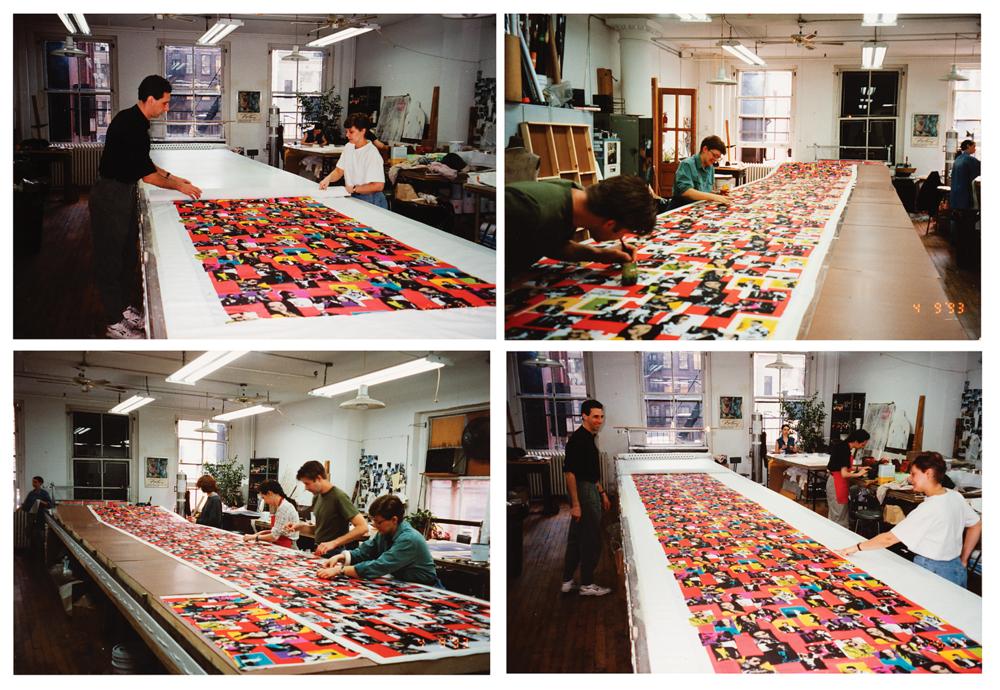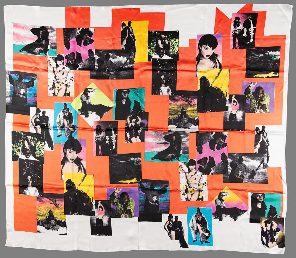 Gorgeous hand-painted New Power Generation fabric, 38 x 44, featuring a brilliant ‘pop art’ design of vibrant color and sundry images of NPG band members. Resembling that of a scarf or perhaps tapestry, the fabric, wich was created by an unknown studio commissioned by the PRN wardrobe department, was used for multiple Prince and Mayte outfits; notably for Prince’s outfit for the TOTP 1994 on the BBC Channel, and for Mayte’s outfit in the ‘Race’ video clip from the video for ‘The Beautiful Experience.’ The final result proved so impressive that Prince kept the fabric for himself and his then-girlfriend and future wife, Mayte Garcia, the fabric’s most prominent and beautiful subject. Included with the fabric are five original color glossy candid photos of the studio members hard at work creating the fabric, which, at full length, stretched across several tabletops. The photos are dated to March and April of 1993, indicating that the fabric took several weeks for the artists to complete, an unsurprising notion given the intricate and eye-popping artwork. In fine condition. At a period of time when digital printing did not exist, this fabric was an amazing achievement in terms of ‘printed/painted’ fashion design.