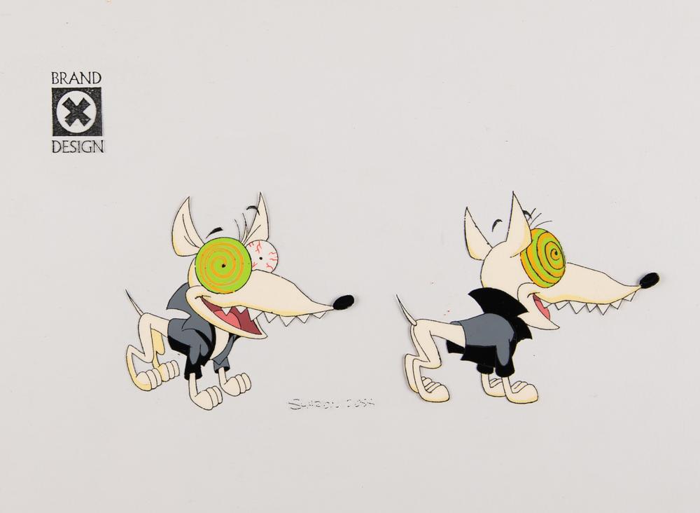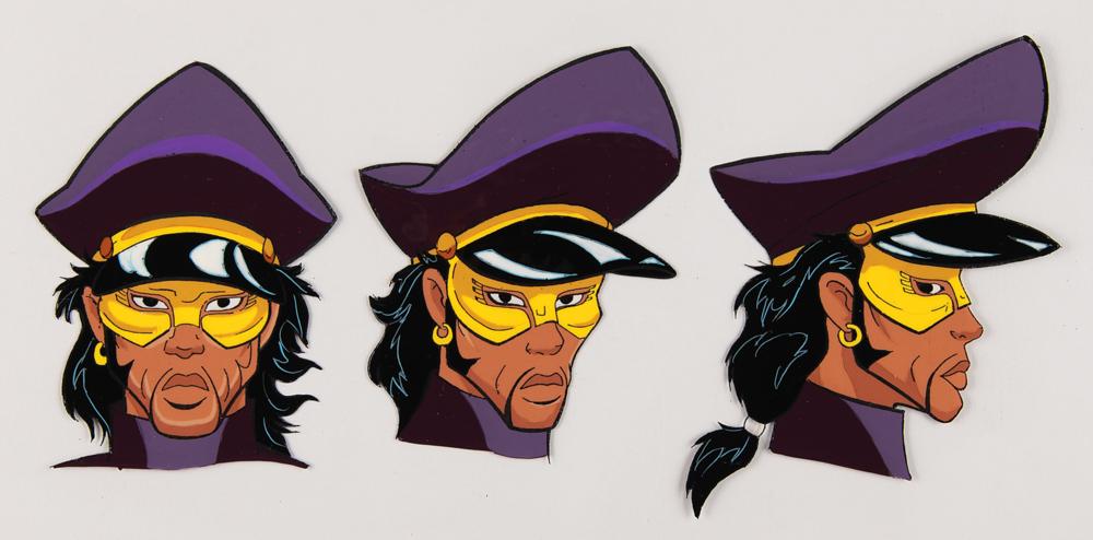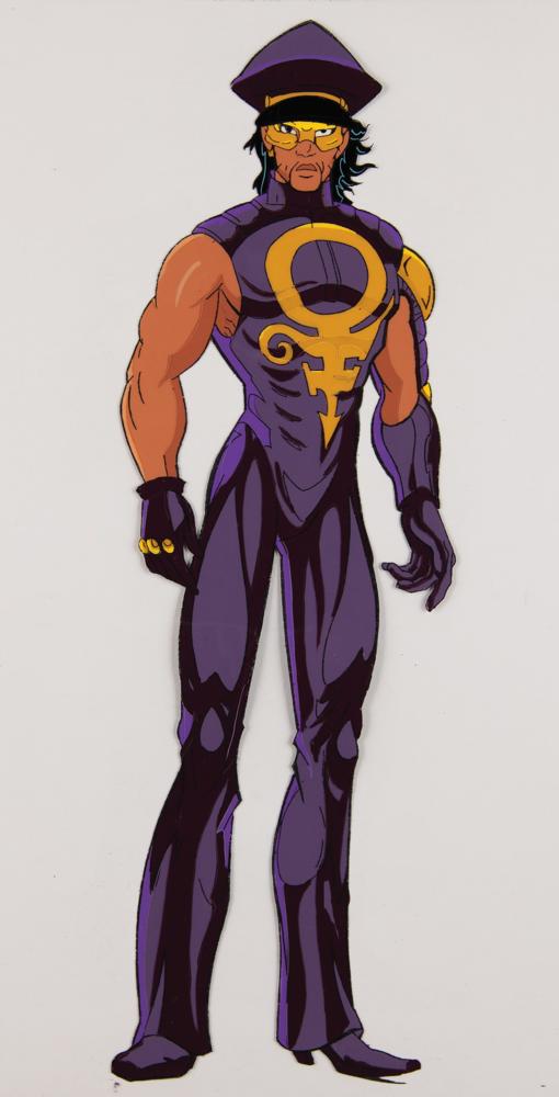 Six unique original hand-painted production cels from Prince's "MPLS" animated music video, all accomplished on 10.5 x 12.5 celluloid sheets, highlighted by three of Prince in his cartoon form. Subjects are: Prince dressed in a yellow cape, playing an iconic blue guitar; a trio of Prince portraits with him in a cap and golden mask, shown at three slightly different angles; a full-length image of Prince in a tight 'Love Symbol' super hero suit; one of the video's characters in an electrocuted, skeletonized form; a pair of small white dogs with spiraled and bloodshot eyes; and a bright yellow fish taxi. The cel set is housed in a folder from Philippine Animation Studio, Inc. In overall fine condition, with creasing to the folder.