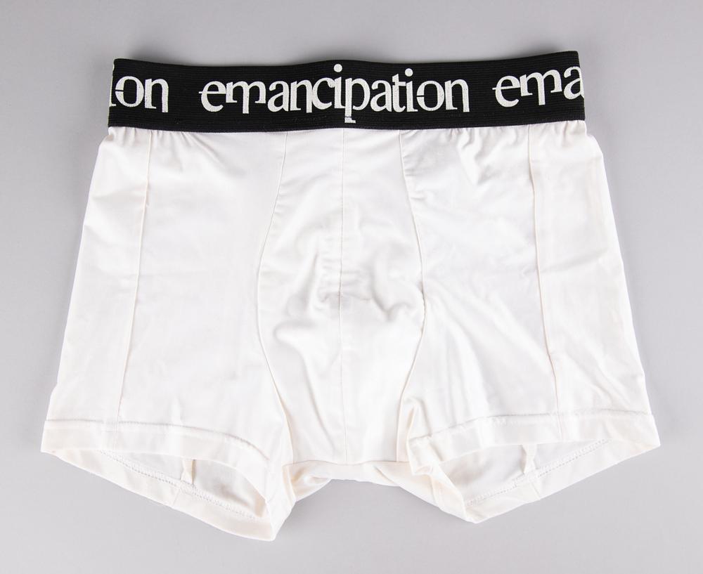 Rare promotional boxer briefs from Prince's 'Emancipation' era, size M, constructed of shimmering white lycra with a black elastic waistband, silk-screened "Emancipation" in white. In fine condition. Consignor notes that these originate from the Paisley Park wardrobe department.