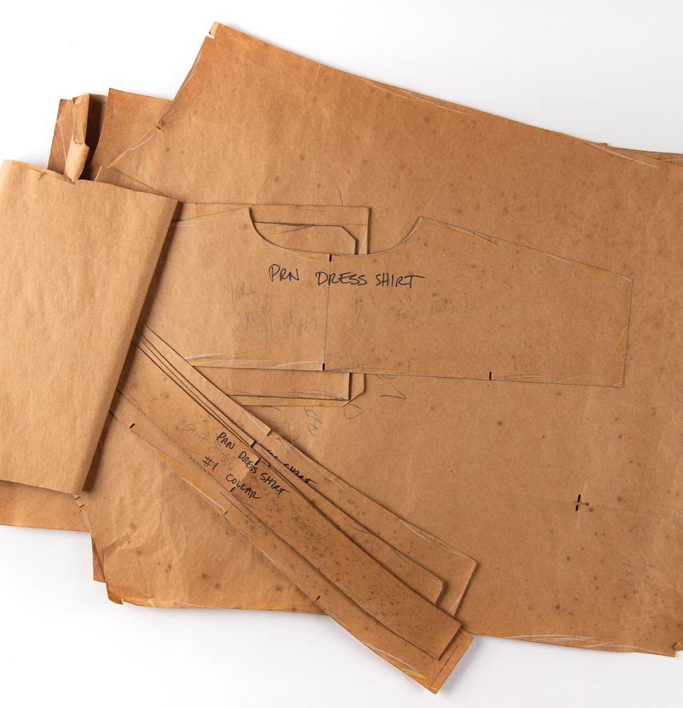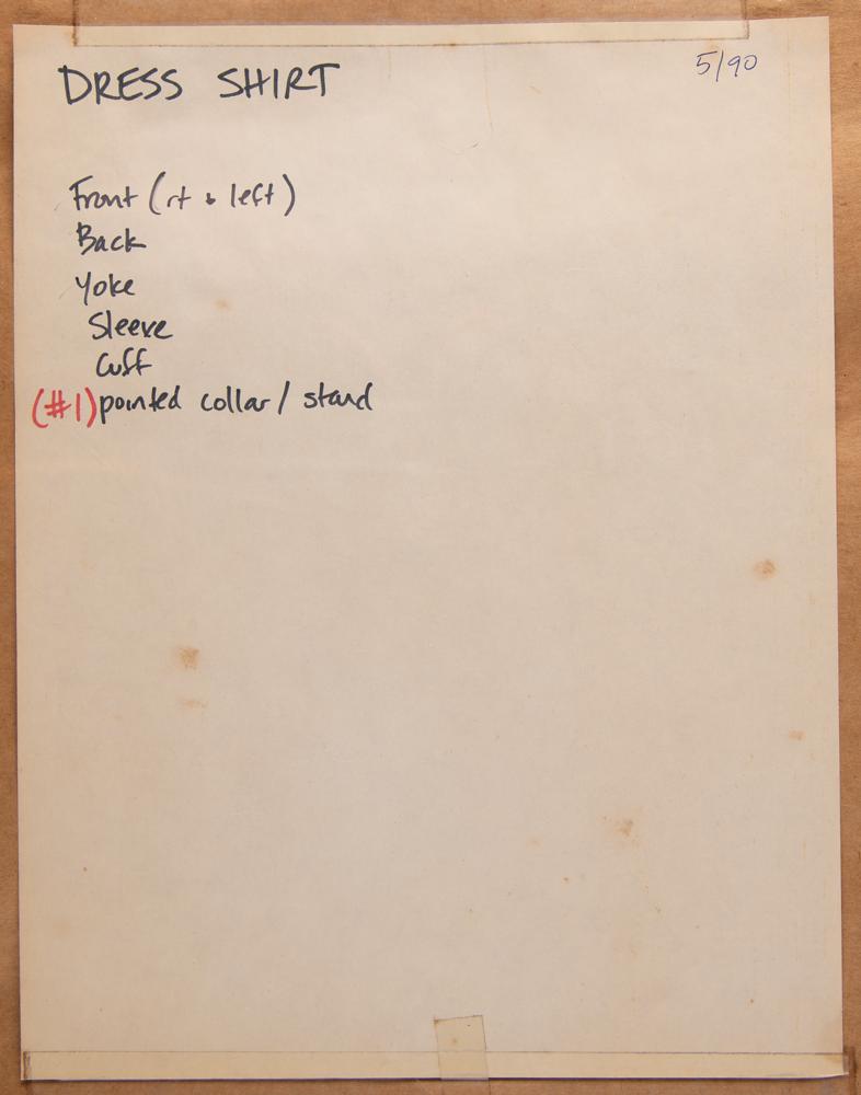 From the PRN wardrobe department — an 11-piece garment pattern design for a dress shirt worn by Prince during the Batman and Graffiti Bridge era. The sheets range in size from 10 x 5.5 to 27 x 26.5 and contain detailed measurements and sewing patterns, elements necessary to reproduce a shirt at Prince’s exact size. Annotated in pencil and felt tip, the sheets are dated to July and November 1989, and the cover sheet is dated to May 1990 and lists the included pattern shapes: “Dress Shirt - Front (rt & left), Back, Yoke, Sleeve, Cuff, (#1) pointed collar / staid.” All of the sheets are marked “PRN Dress Shirt.” Includes the original pattern hanger. In overall very good to fine condition, with scattered creases and folds, and some small edge tears. A unique opportunity to recreate a dress shirt with Prince’s exact measurements.