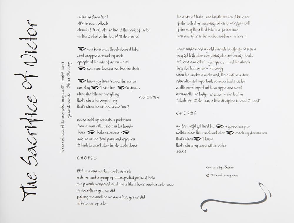 Rare book: Prince Presents The Sacrifice of Victor. First edition. Paisley Park Enterprises, 1994. Hardcover, 12.5 x 9.25, 103 pages. This highly sought-after volume presents a black-and-white pictorial journey of Prince during the 1993 Act II Tour, and features beautiful monochrome photographs taken by Terry Gydesen providing a rare and unique glimpse at life on the road with Prince. In very good to fine condition, with the dust jacket absent, some small edge tears to the bottom corners of the last two pages, and a business card for Paisley Park's wardrobe department stapled to the first free end page. This hardcover version of the out-of-print book is extremely difficult to find. Consignor notes that this book originates from the Paisley Park wardrobe department.