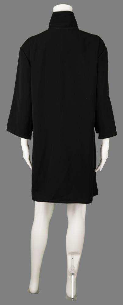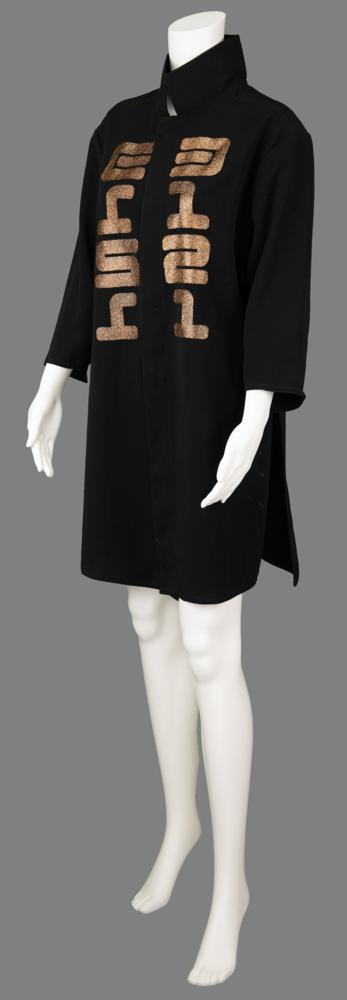 Chef's jacket from the 3121 parties hosted by Prince in 2006, designed by Lady J exclusively for the events, crafted from black fabric with "3121" executed in a glittery mirror-image futuristic font down the front in both standard and mirror-image numbers. The front features three black buttons with concealed closures, and the "J. Gerard / Design Studios" label is sewn into the collar, with a "2" size tag below. In fine condition.