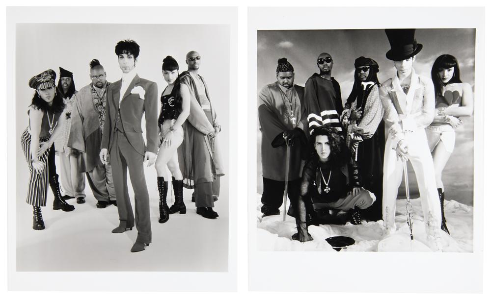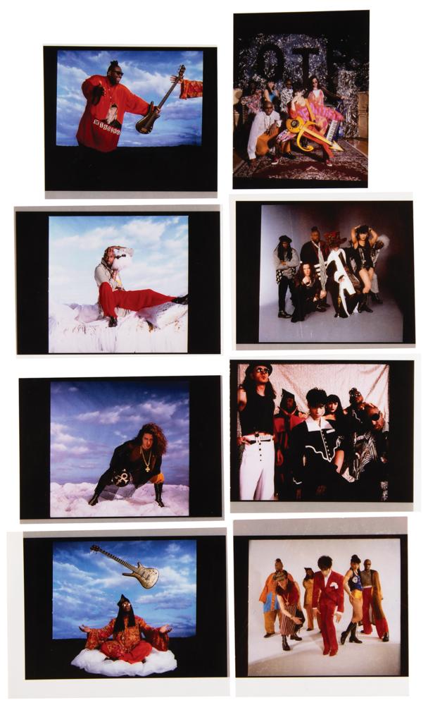 Remarkable archive of 62 original color glossy 4 x 6 Kodak photographs of outfits and costumes created for Prince, Mayte, and members of the New Power Generation, taken by an employee of Paisley Park's wardrobe department for Prince's approval. These amazing and unique images focus on designs developed for Prince, and the outfits are often modeled on mannequins stenciled with his name. Among these are a cropped 'Love Symbol' gold medallion coat, a white jacket with an ornate gold metal collar, a yellow 'Love Symbol' jacket, a black one-piece 'Love Symbol' jumpsuit, a unique cropped blouse with hand symbols, a shimmering yellow wide-lapeled jacket, a white suit with Eiffel Tower designs on the legs, a golden breastplate necklace, an "Exodus Has Begun" golden belt, a blue 'cloud' shirt, some unique newspaper patchwork tops, a 'Barbarella' dress, and several other unique styles. Additionally includes an original Polaroid of a 'shattered mirror' suit, eight smaller color images of Prince and his band members, and two 8 x 10 black-and-white photos of Prince and his band. In overall fine condition. A unique and fantastic chronicle of Prince's stylish stagewear.