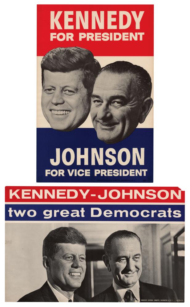 Superb pair of original color posters for John F. Kennedy’s 1960 presidential campaign, 13.5 x 20.75 and 20.75 x 13.5, both feature a patriotic color scheme, portrait images of JFK and running mate Lyndon B. Johnson, and bold white text, “Kennedy for President, Johnson for Vice President” and “Kennedy - Johnson, two great Democrats.” Both posters were produced by the Democratic National Committee. In overall fine condition, with a chipped upper right corner and old tape remnants to reverse of the horizontal poster.