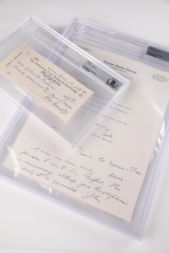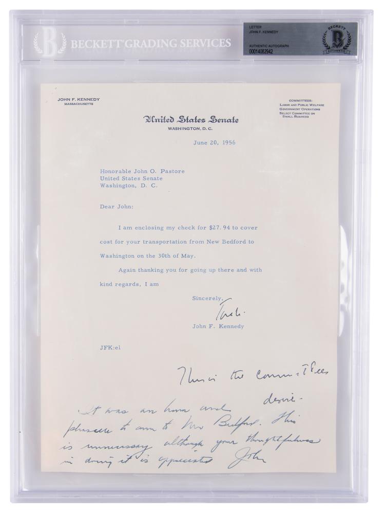 Tandem of items signed by John F. Kennedy as a Massachusetts senator — a TLS signed “Jack” and a rare personal check signed “John Kennedy” — both sent to Rhode Island Senator John Pastore during Kennedy’s unsuccessful bid for the Vice Presidential nomination at the 1956 Democratic National Convention. The TLS, one page, 8 x 10.5, June 20, 1956, personal United States Senate letterhead, in full: “I am enclosing my check for $27.94 to cover cost of your transportation from New Bedford to Washington on the 30th of May. Again, thank you for going up there and with kind regards.” Kennedy has added a handwritten postscript below: “This is the committee’s desire.” Beneath this inscription, Pastore has written a note back to Kennedy, “It was an honor and pleasure to come to New Bedford. This is unnecessary although your thoughtfulness in doing it is appreciated, John.” The accompanying personal check (The National City Bank of New York), 6.25 x 2.75, filled out in another hand and signed by Kennedy, made payable to Pastore for $27.94, dated June 19, 1956. made out to John O. Pastore. Boldly signed "John Kennedy." In overall fine condition. Both items are individually encapsulated in Beckett authentication holders.