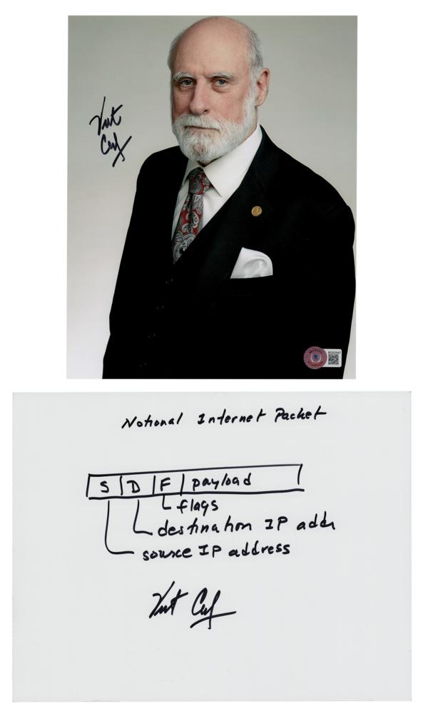 Two items: a color satin-finish 8 x 10 photo of internet pioneer Vint Cerf in a half-length pose, signed in black felt tip; and an original sketch by Cerf of a “Notional Internet Packet,” accomplished in black felt tip on a white 11 x 8.5 cardstock sheet, which is signed below in by Cerf. In overall very fine condition.