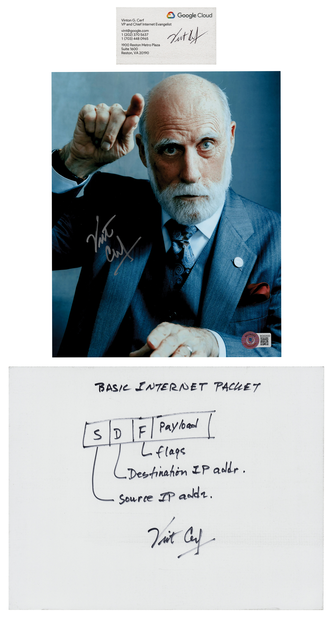 Three items: a color satin-finish 8 x 10 photo of internet pioneer Vint Cerf, signed in silver ink; an original sketch by Cerf of a “Basic Internet Packet,” accomplished in black felt tip on a white 11 x 8.5 cardstock sheet, which is signed below in by Cerf; and one of Cerf’s personal Google Cloud business cards, 3.5 x 2, which is signed in black ballpoint. In overall very fine condition.