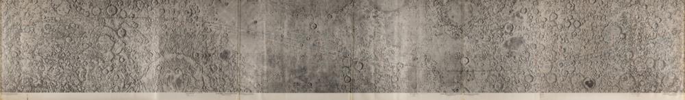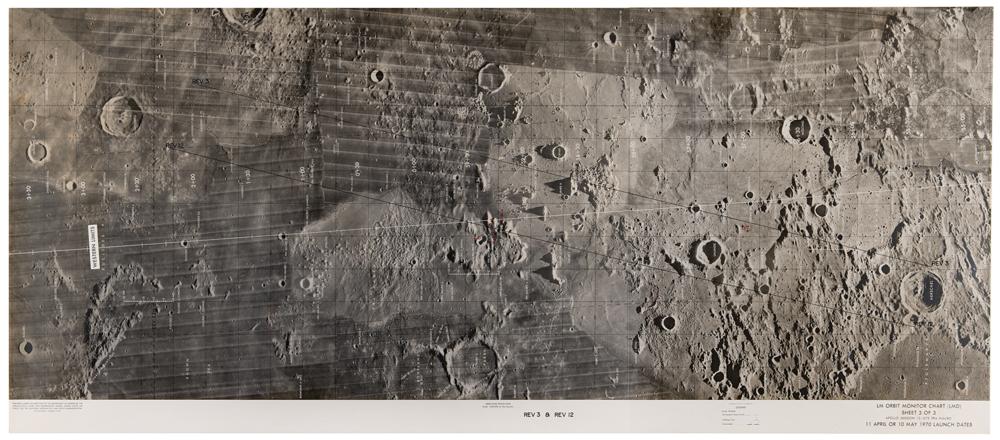 Impressive first edition satin-finish 55.5″ x 24″ photographic chart for the Apollo 13 mission entitled ‘LM Orbit Monitor Chart, Sheet of 3 of 3,” scale 1:650,000 at the equator, with an overhead view of Revolutions 3 and 12, which includes the Fra Mauro landing site. The chart bears a few handwritten notations in red felt tip. Prepared under the direction of the Department of Defense by the Aeronautical Chart and Information Center.