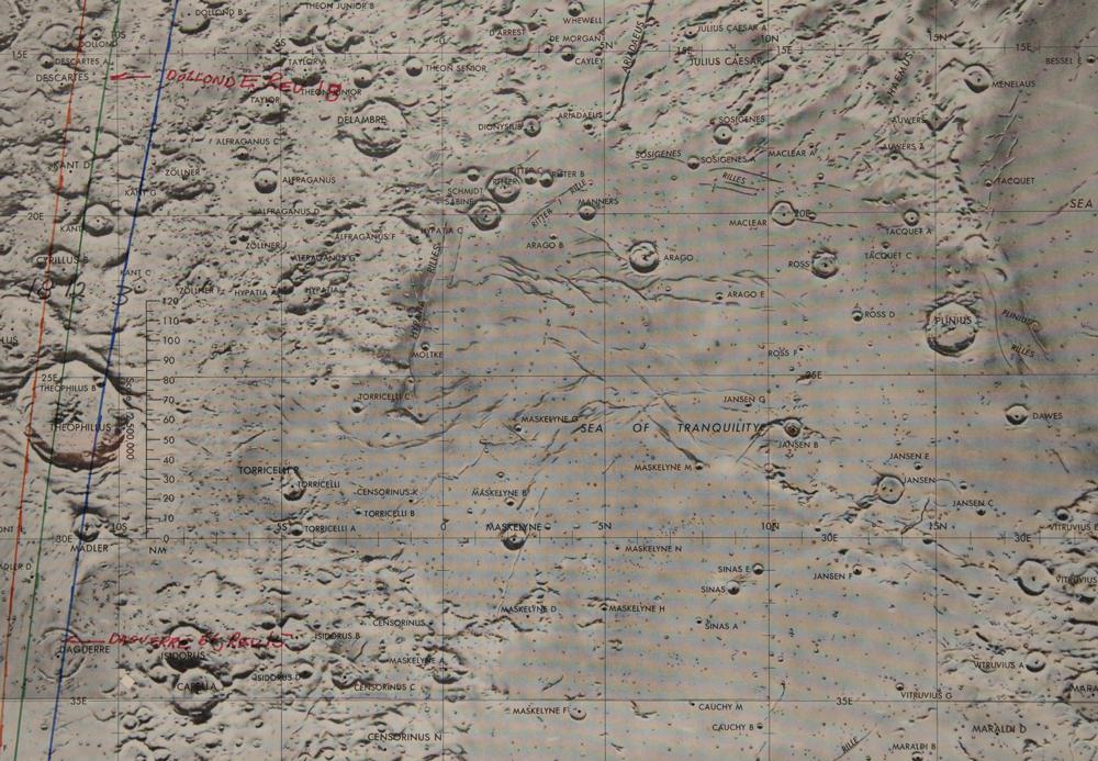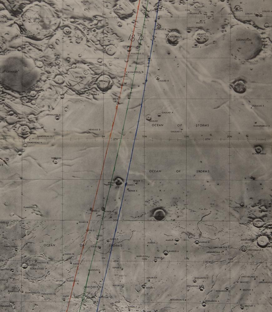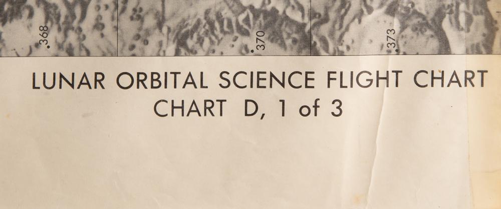 Massive pair of first edition charts entitled ‘Lunar Orbital Science Flight Chart, Chart D,’ individually marked on the reverse in black felt tip, “Lunar Orbit Chart A, Copy, 9/8/70” and “Lunar Orbit Chart B, 9-10-70, (REVS 19-34).” The ‘Chart A’ example consists of four taped sheets containing all three charts, measuring an impressive 170″ x 26.5″, with the lower border marked in different colored felt tip, “REV 3, REV 12, REV 18”; and the ‘Chart B’ example is comprised of three taped charts, measuring 171″ x 26.5″, with the lower border marked “REV 20, REV 26, REV 33” twice. The corresponding revolutions to both charts are drawn and annotated across their full length, passing by notable landing sites the Sea of Tranquility, Fra Mauro, and the Ocean of Storms. Both lithographed by ACIC 3-70 and prepared under the direction of the Department of Defense by the Aeronautical Chart and Information Center.