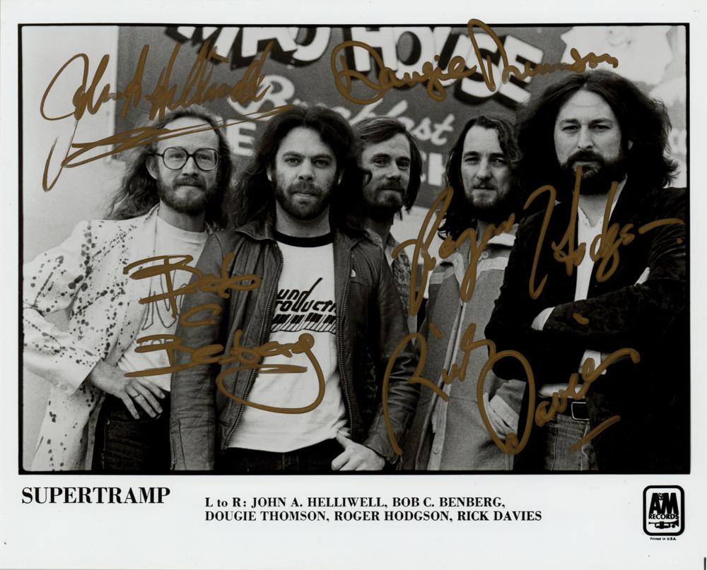 Glossy 10 x 8 A&M Records publicity photo of Supertramp, signed in gold ink by John A. Helliwell, Bob C. Benberg, Dougie Thomson, Roger Hodgson, and Rick Davies. In fine condition.