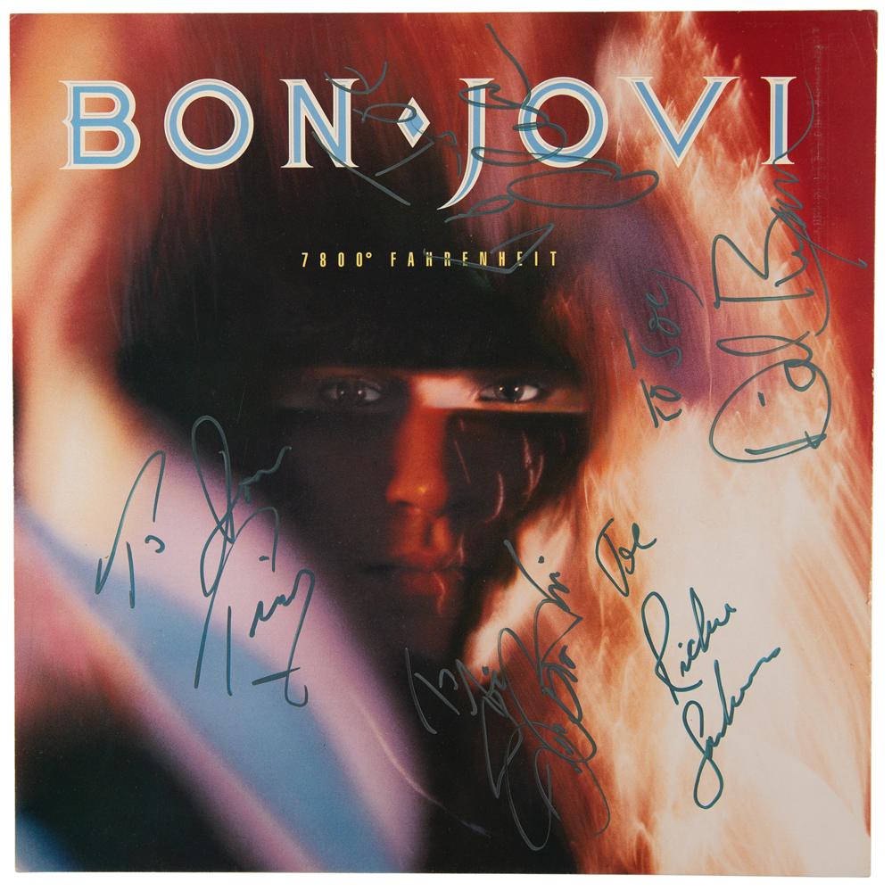 Album flat for the Bon Jovi album 7800° Fahrenheit, signed in silver ink by Jon Bon Jovi, Richie Sambora, Alec John Such, Tico Torres, and David Bryan, with each adding an inscription to “Joe.” In fine condition. The record is not included.