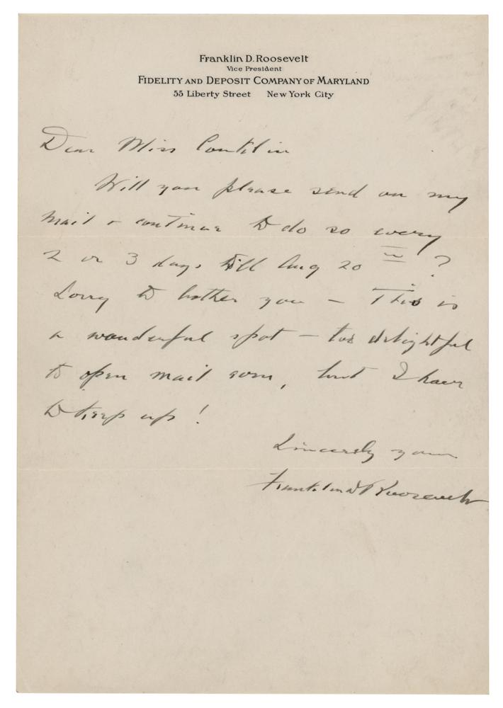 Scarce ALS, one page, 7.25 x 10.5, Fidelity and Deposit Company of Maryland letterhead, no date. Handwritten letter to "Miss Conklin," in full: "Will you please send on my mail & continue to do so every 2 or 3 days till Aug. 20th? Sorry to bother you—This is a wonderful spot—too delightful to open mail soon, but I have to keep up!" In fine condition.