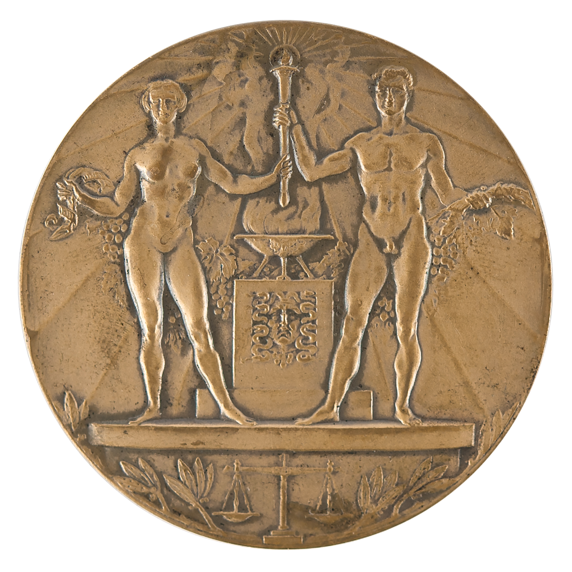 Appealing participation medal issued for the Amsterdam 1928 Summer Olympics. Bronze, 55 mm, 59 gm, by J. C. Wienecke. The front features nude male and female athletes on a podium holding a torch over the Olympic flame, with a balance on laurel branches in exergue; the reverse bears the goddess Nike over Marathon Tower, the shield of Amsterdam between two hemispheres, and the Olympic stadium in the background, with the legend: "IXe Olympiade, Amsterdam, 1928."