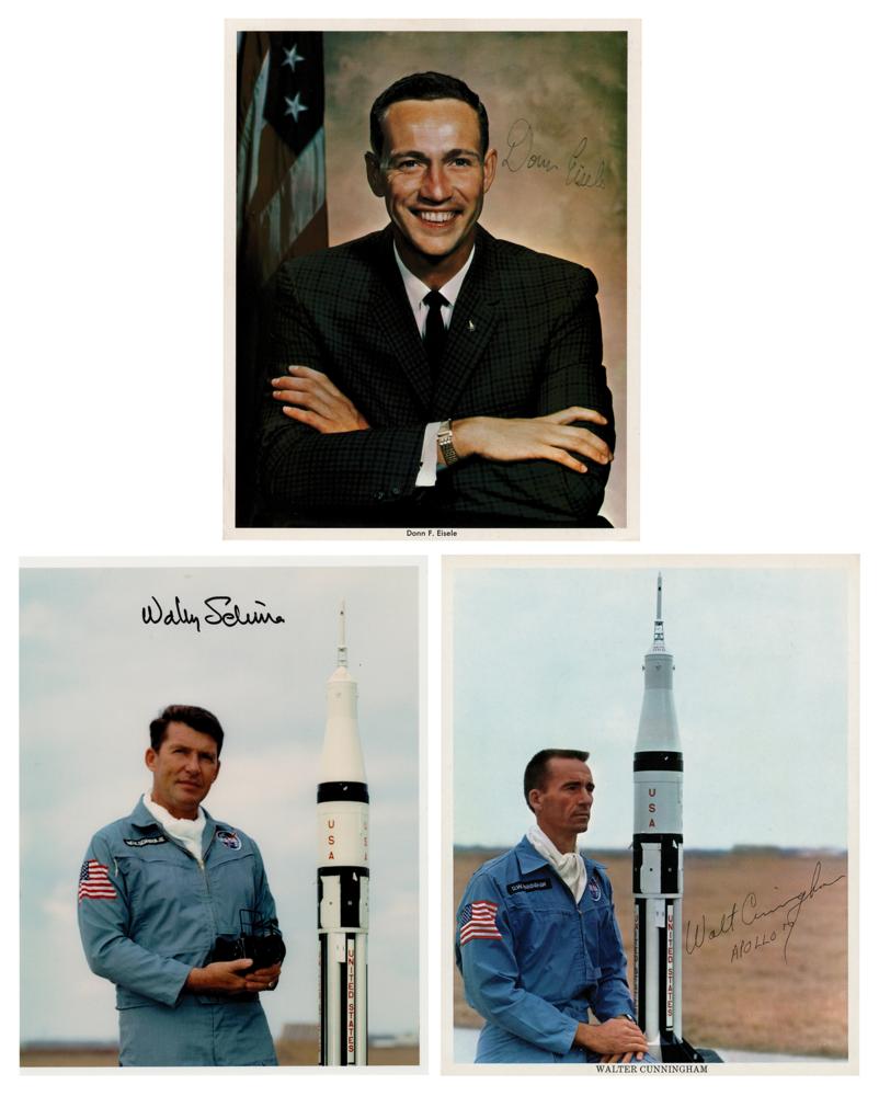 Three color 8 x 10 photos of the Apollo 7 astronauts, two of which are official NASA lithographs, each signed in black ballpoint or felt tip by the pictured astronaut: “Donn Eisele,” “Wally Schirra,” and “Walt Cunningham, Apollo 7.” In overall fine condition, with a few small surface creases, and a trimmed left edge to the Schirra photo.