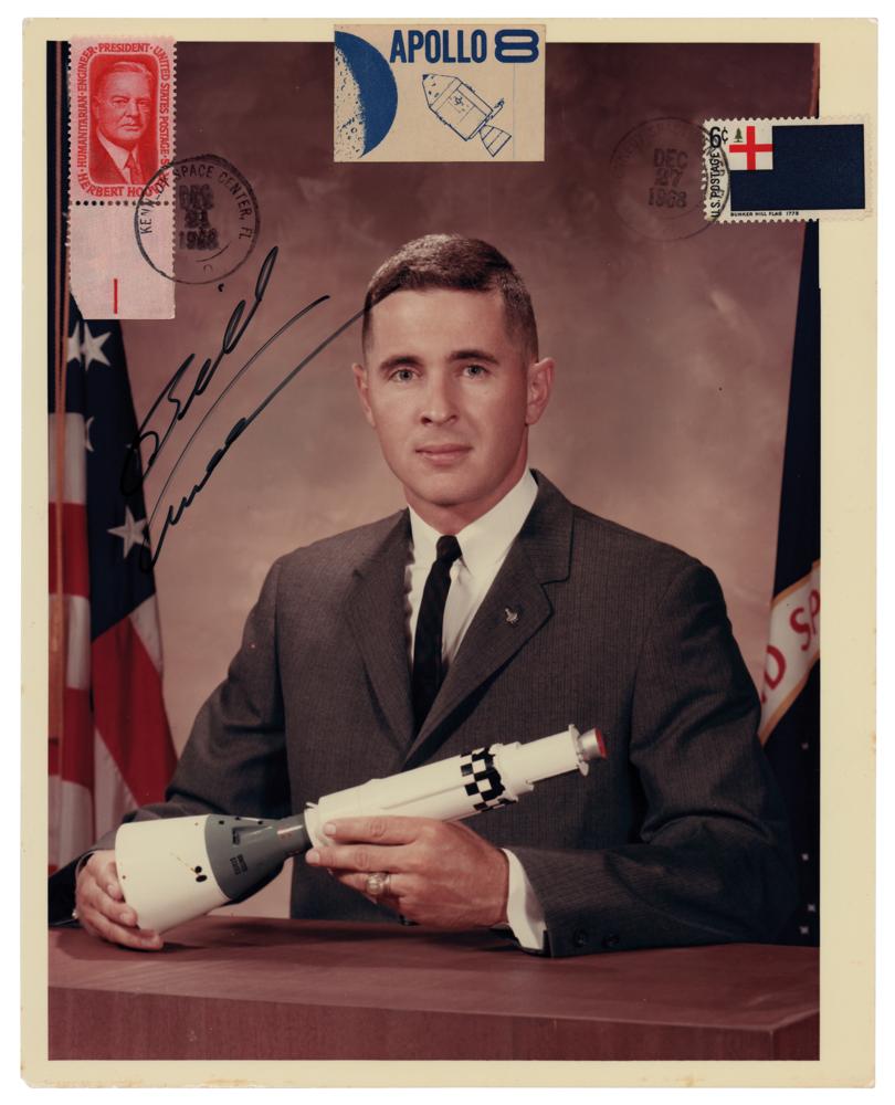 Desirable official color glossy 8 x 10 NASA portrait photo of Bill Anders holding a spacecraft model in a formal pose, with an astronaut pin visible on his left lapel, signed nicely in black felt tip. The upper portion bears affixed stamps and labels and two cancellations dated to December 1968. The reverse bears ownership stamps, NASA caption text, and "A Kodak Paper" watermarks. In fine condition.