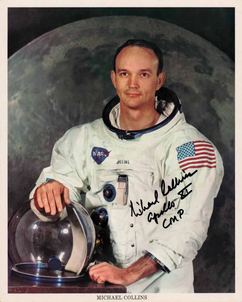 Official color 8 x 10 NASA lithograph of Michael Collins posing in his white space suit against a large lunar backdrop, signed nicely in black felt tip, "Michael Collins, Apollo XI, CMP." In fine condition. An exceptional uninscribed example of this classic Collins NASA portrait.